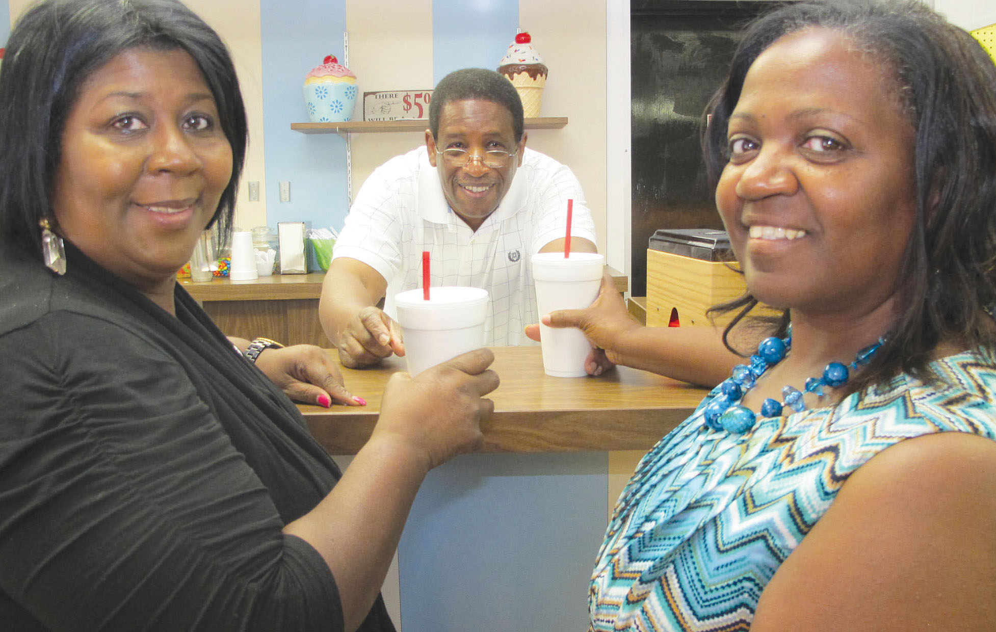 Sam Holmes, owner of Abba’s Sweet Treat, serves milk shakes to customers Genesis Harley and the town’s post master Emma Oliver.