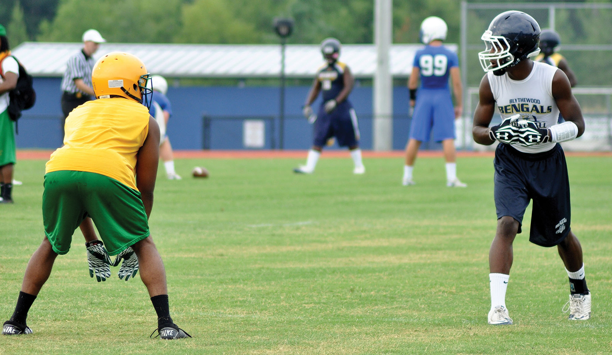 High schools from across the state gathered at Blythewood High School Saturday to test their passing and pass defense games. Linemen also tested their skills in the Top-Dawg Lineman Challenge, won this year by Lancaster High School. Wren High School defeated Irmo 28-11 in the finals to win the 7-on-7 passing tournament for the second consecutive year. Pictured: Blythewood’s Darius Wilson looks in for the signal against C.A. Johnson.