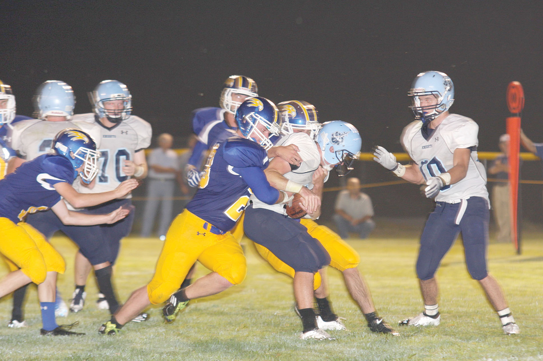The second quarter began with the Eagles in possession, but once again they were unable to make any progress down field and punted. The Knights offensive machine went back to work and produced touchdown number three when Berry again connected with Fulmer for a 65-yard pass completion. The PAT was no good, and with 10:46 left in the first half, the Knights led 20-0.