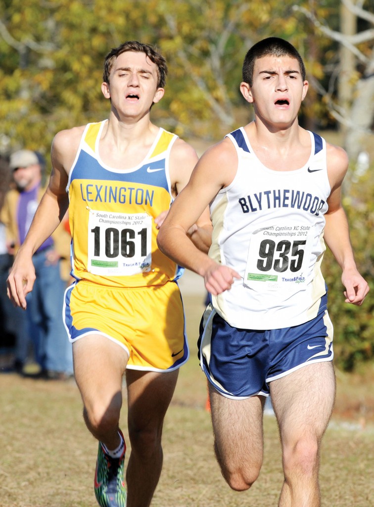 Blythewood’s Mike Lantz (right) fights off his Lexington challenger on his way to a third-place finish in Saturday’s State cross country meet.