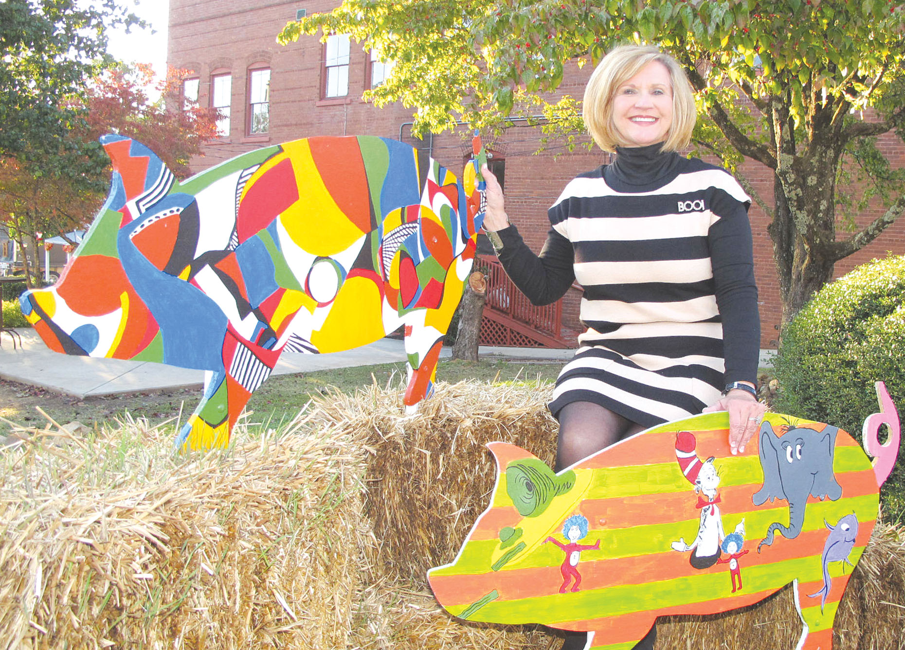 Ridgeway Mayor Charlene Herring shows off two of the painted pigs that decorate yards and store fronts in downtown Ridgeway to remind folks of the upcoming Pig on the Ridge barbecue festival, Nov. 2-3.