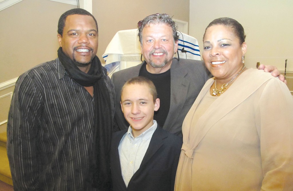 Sheila Ray Charles (right), the daughter of legendary singer Ray Charles, and her husband Tony Steptoe (left) visited the Rev. Jimmy Burroughs’ (center, back) congregation Sunday at Christ Central Community Center at the request of her young fan Bowen Kelly (front).