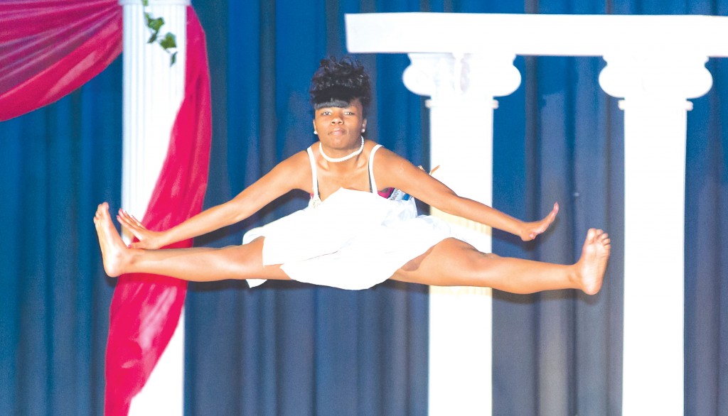 Fairfield Central High School senior Demetria Bell shows off her gymnastic skills during Saturday’s Miss Fairfield Central Pageant.