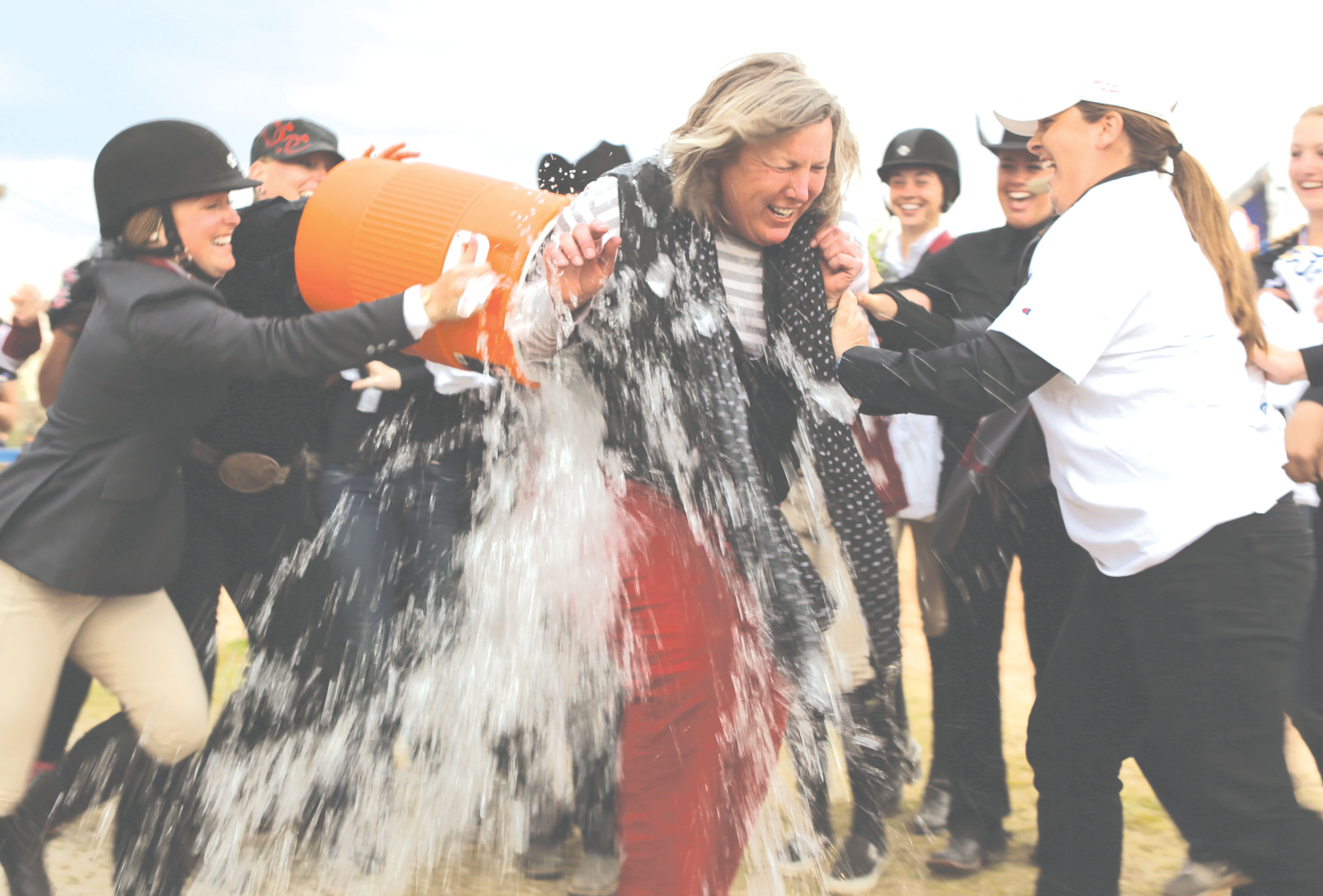 University of South Carolina equestrian team head coach Boo Major is doused with Gatorade on March 30 by team members following the Gamecocks’ upset of Auburn to win the SEC Championship.