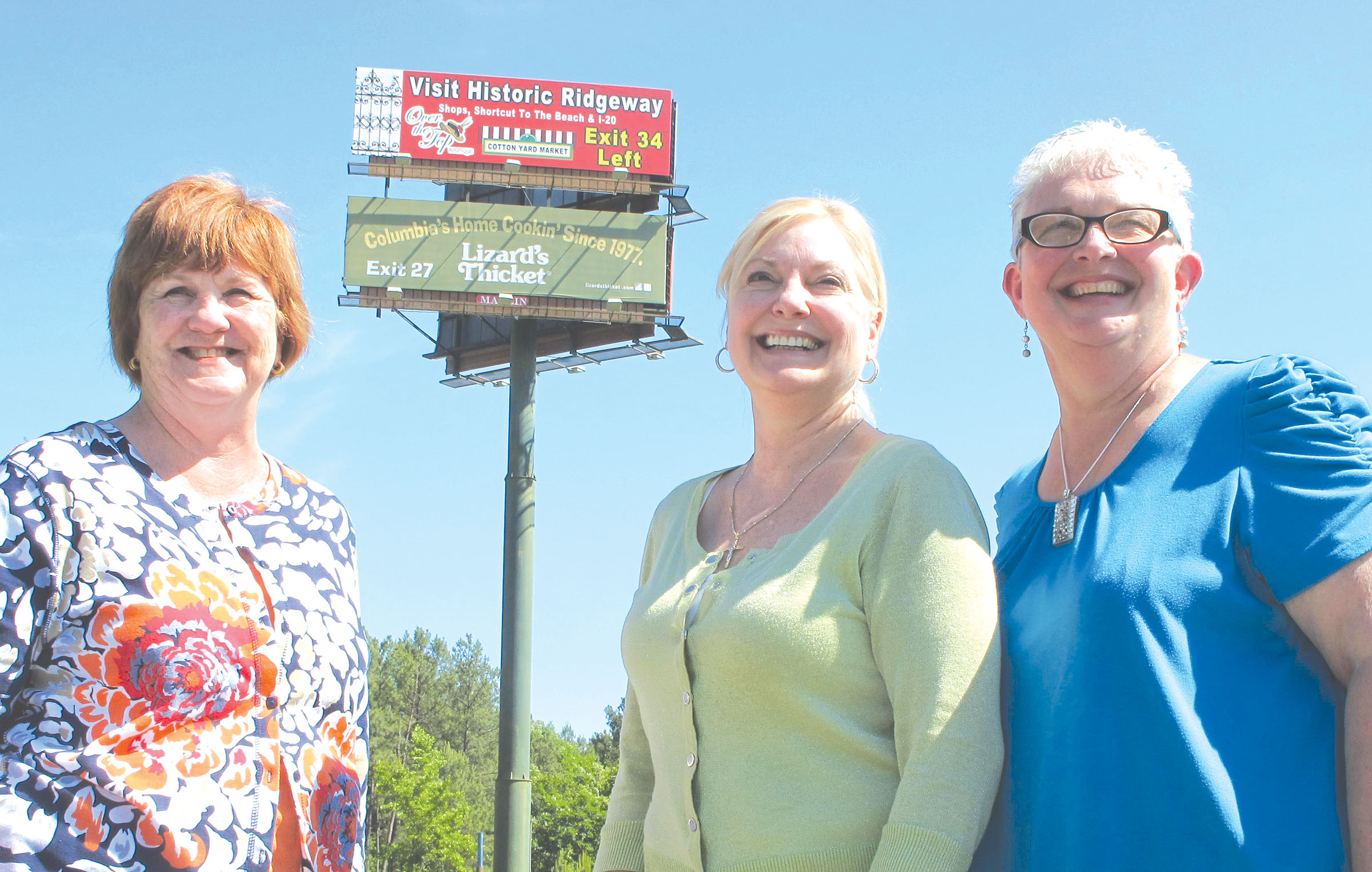 Wanting to show off their town to visitors, Ridgeway shop owners Tina Johnson (Over the Top Emporium), center, and Jenny Price (co-owner of The Cotton Yard Market), right, purchased a big red billboard to catch the attention of southbound travelers on I-77. The billboard is posted at exit 40, and instructs motorists to exit at the next exit (34) for Ridgeway. “It’s something we wanted to do not just for our shops, but for all the shops in our town,” Johnson said. At left is Terry Vickers, president of the Fairfield County Chamber of Commerce. Vickers works with area shop owners to bring tourists and shoppers to Fairfield County and Blythewood.