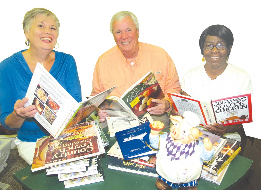 Pouring over cookbooks from the county’s kitchens are Norma Branham, left, known throughout the county for her good home cooking, especially her fudge and cheesestraws; Gary Freeman of the Can’t Quit Smokin’ BBQ team, who cooks frequently at the Church of the Nazarene in Winnsboro; and Lelia Mae Woodard, who heads up her church’s crock pot ministry, supervises the kitchen at Shady Grove Independent Church on Highway 34 and whose specialty is pot roast.