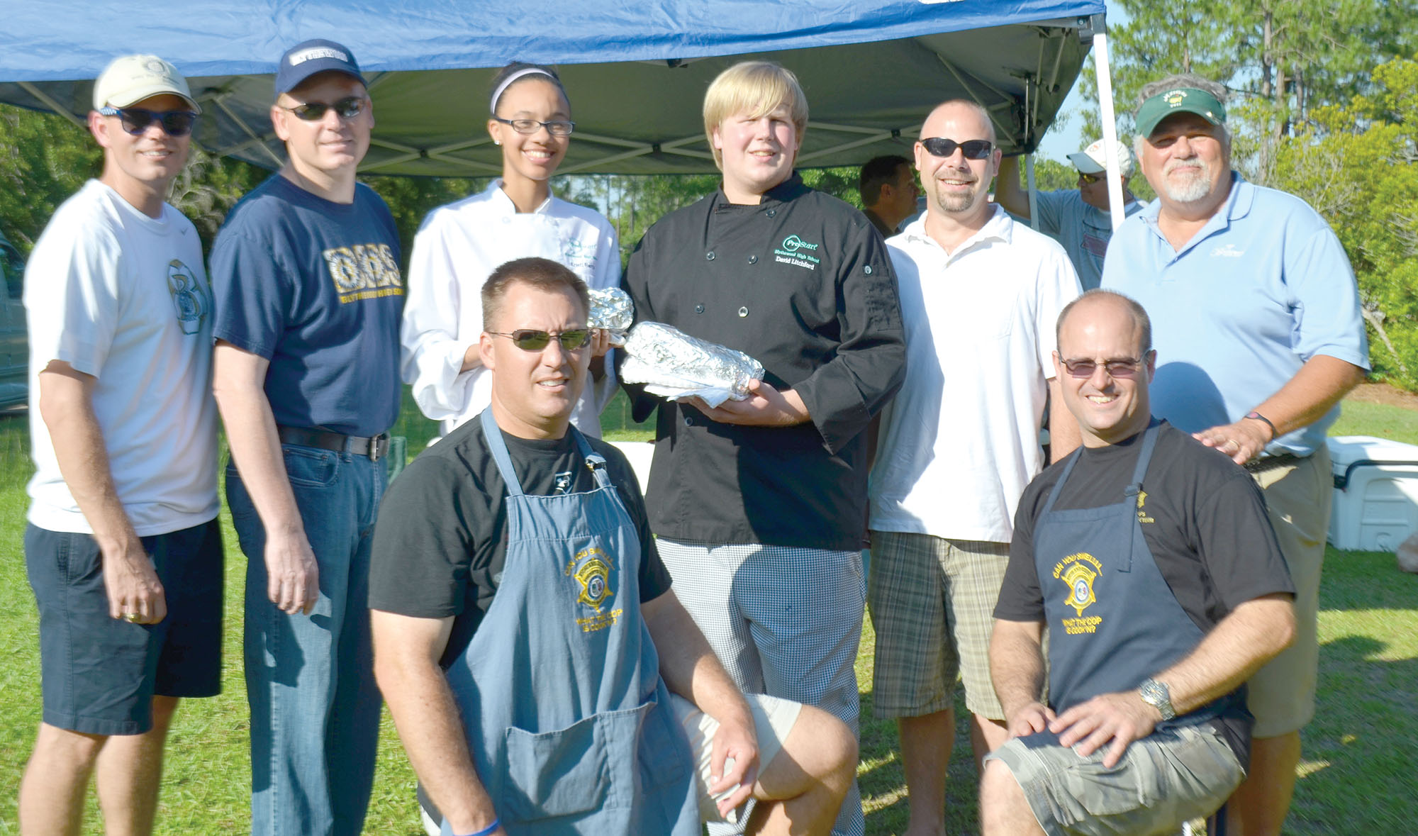 The Blythewood Rotary Club cooked 96 Boston Butts last week and raised $2,500 in support of community projects including providing dictionaries in elementary schools, supporting the Australian/BHS culinary exchange program and Salkehatchie, and adopting families in need. Some of the volunteers for the cook out were, back row from left, BHS Principal Keith Price, Chef William Turner, BHS students Kristi Harris and David Litchford, Chef Tom Sedio, Blythewood Mayor Mike Ross and Rotarians David and Captain Chris Cowan of the Richland County Sheriff’s Department.