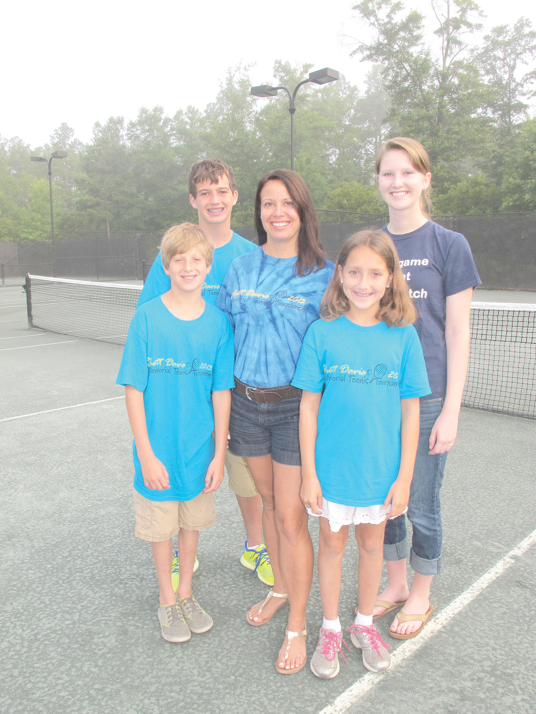 The third annual three-day Rhett Davis Memorial Tennis Tournament at Cobblestone Park was a big success last weekend with 183 players and almost 300 participating in the silent auction on Friday evening. The late Davis, a firefighter, was an avid tennis player and the tournament raises funds to buy tennis equipment for Blythewood High School and for scholarships for BHS students. Shown above are Davis’s wife Aggie, center, and their children, from left, Jackson, 11; Blake, 14; Blake, 9 and Mary Braden Murphy, who was one of this year’s two $5,000 scholarship recipients. Murphy will attend Champlain University in Burlington, VT where she will study computer and digital forensics. The other scholarship winner, R. J. McDowell, is not shown. McDowell will attend Furman University where he will study music.