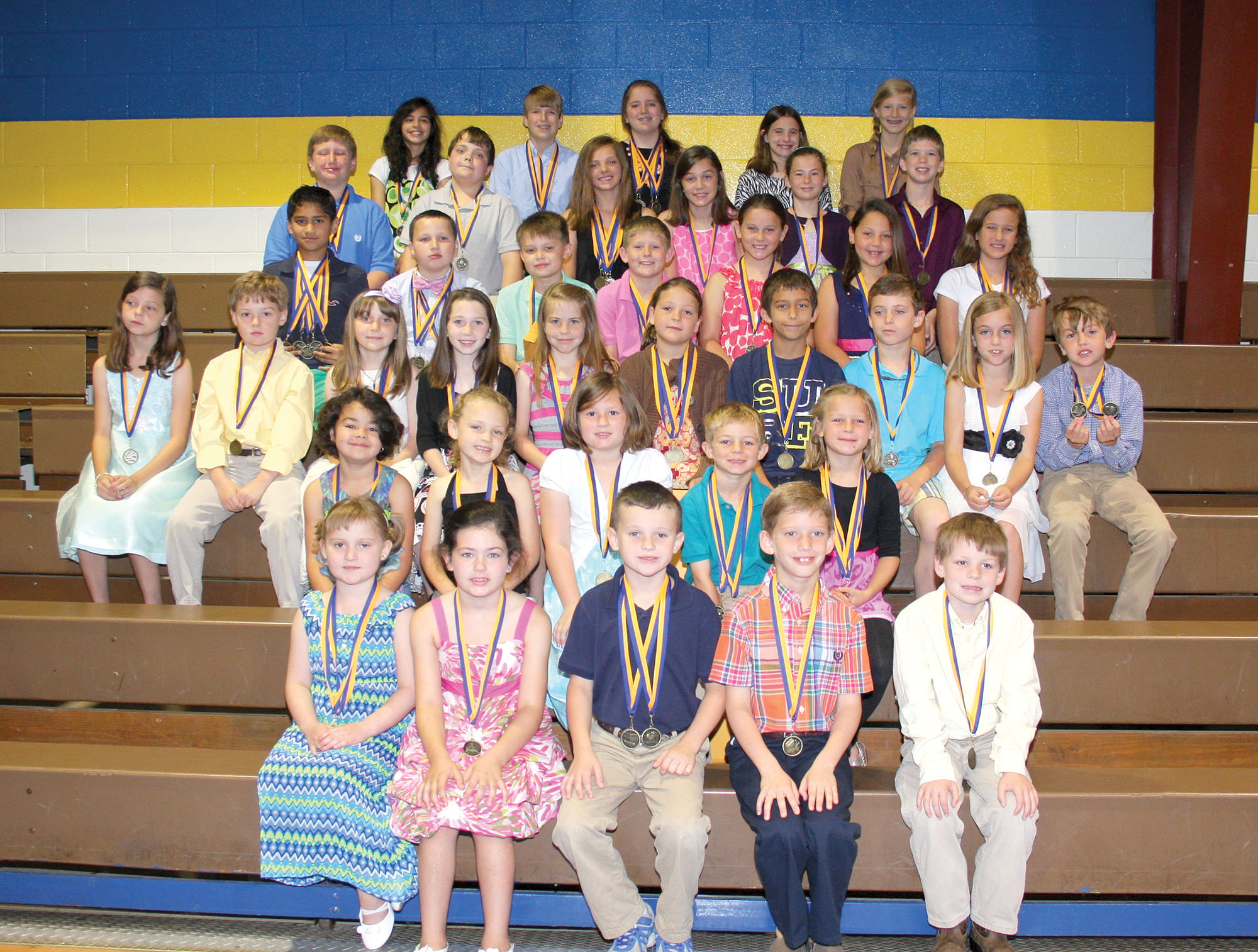 (l-r) First Grade: Lily Baggott-Spelling, Reading; Meagan Brigman-Reading; Drew Spires-Math, Spelling; Miller Stuck-Language; Travis Bonds-Math. Second Grade: Lily Hawkins-Language; Maggie Hughes-Reading, Spelling; Morgan Raley- Reading; Kitt Nicholson- Math, Spelling; Anna Grace Martin- Math, Language, Spelling. Third Grade: Emily O’Connor-Creative Writing ; Wyatt Raley- Reading; Elena Frick- Reading, Creative Writing; Samantha Rabon- Math; Autumn Keys- Spelling; Mikaela Miller- Math, Spelling; William Spang- Science; Colten Hatchell- Science; Samantha Wilkes- Language; Berry Bonds- Language, Social Studies. Fourth Grade: Aryan Patel- Math, Language, Reading, Spelling, Science, Social Studies; Marshall Gibbons- Math, Language, Reading, Spelling; Gavin Douglas- Language; Dru Caldwell- Math, Reading, Spelling, Science, Social Studies; Ainsley Martin- Science; Emma Castles- Math, Social Studies; Taylor Spires- Language, Reading, Spelling. Fifth Grade: Carson Stuck- Math, Reading, Science; Scotty Timms- Social Studies; Ally Robinson- Math, Reading, Spelling, Science, Social Studies; Brooke Pauley- Language; Alice Anne Montgomery- Spelling; Hudson Wade- Language. Sixth Grade: Hannah Gibbons- Spelling; Bradden Steele- Math, Language, Reading, Social Studies, Spelling; Grier Hensley- Math,  Language, Science, Social Studies; Hannah Wilson- Good Citizenship;  Caleigh Caldwell-  Social Studies. Not Pictured: Brinson Baker- First Grade Language; Landon Caulder- Second Grade Math; Matt Tate- Third Grade Social Studies; B Baker- Third Grade Handwriting; Juliet Pineda- Third Grade Handwriting; Zack Taylor- Fourth Grade Science  and Social Studies; Will Carvalho- Sixth Grade Math, Reading, Science, and Social Studies.
