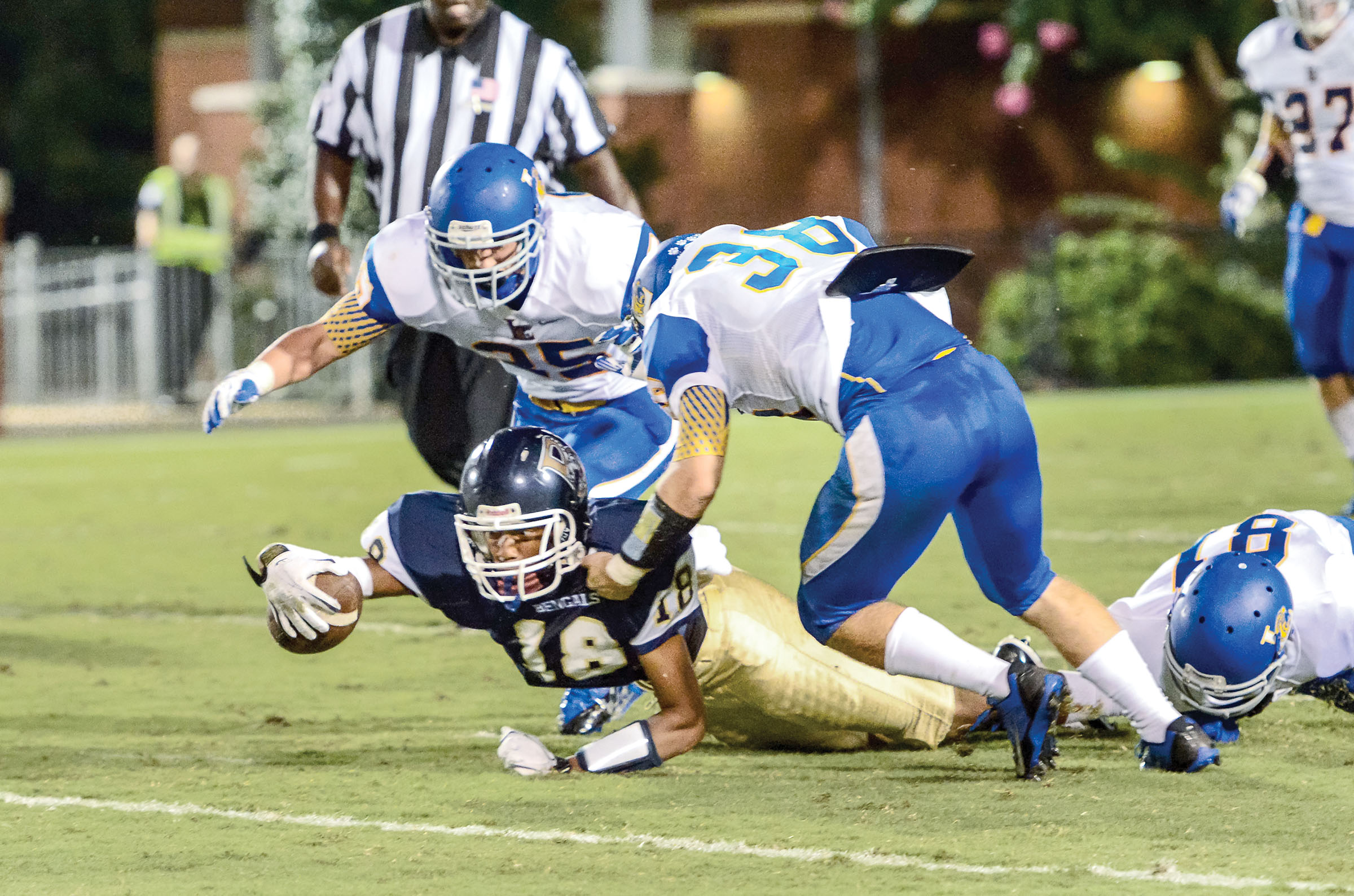 Lexington drove the ball 78 yards on their first possession, but a strong goal line stand by the Bengals stopped the ‘Cats on fourth-and-goal. The Bengals, however, fumbled the ball right back to Lexington on their own 2-yard line moments later, leading to a 1-yard go touchdown run by Lexington quarterback Will Hunter. Christian Kinsley added the extra point to tie the game at 7.