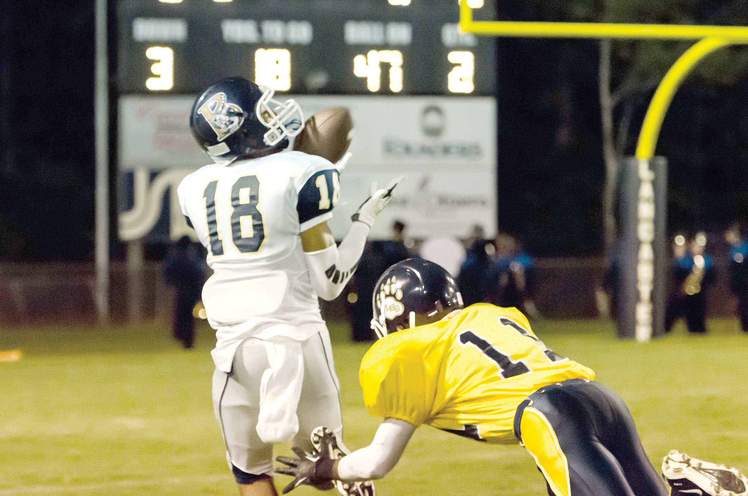 Blythewood’s Deyon Grayer (18) hauls in a touchdown pass from quarterback Javon Smith at Lancaster Friday. (Photo/Kristy Kimball Massey)