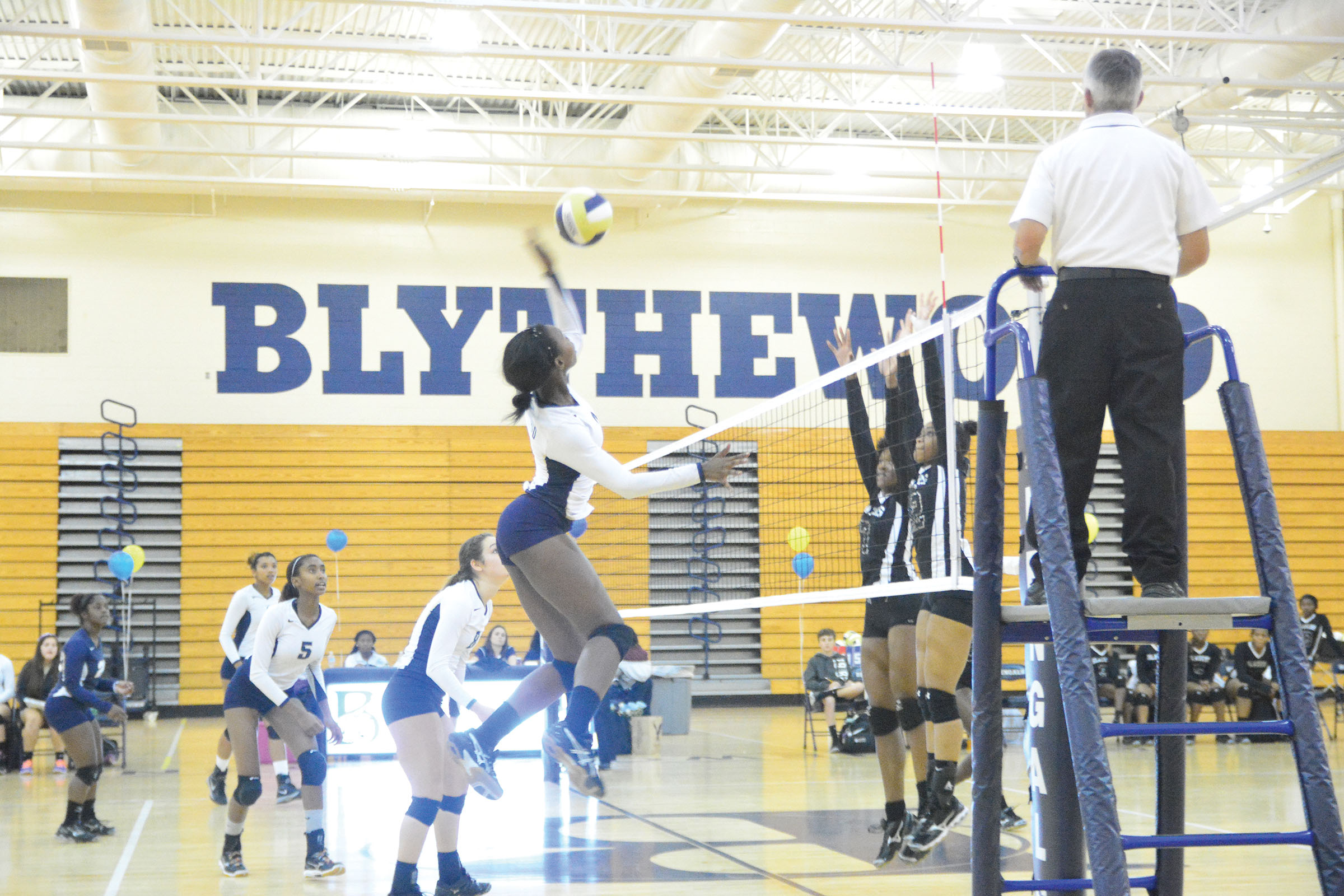 Blythewood’s Brittany Mims leaps to make the return against Ridge View Tuesday. The Lady Bengals dropped the Lady Blazers in straight sets, 25-10, 25-17, 25-17.