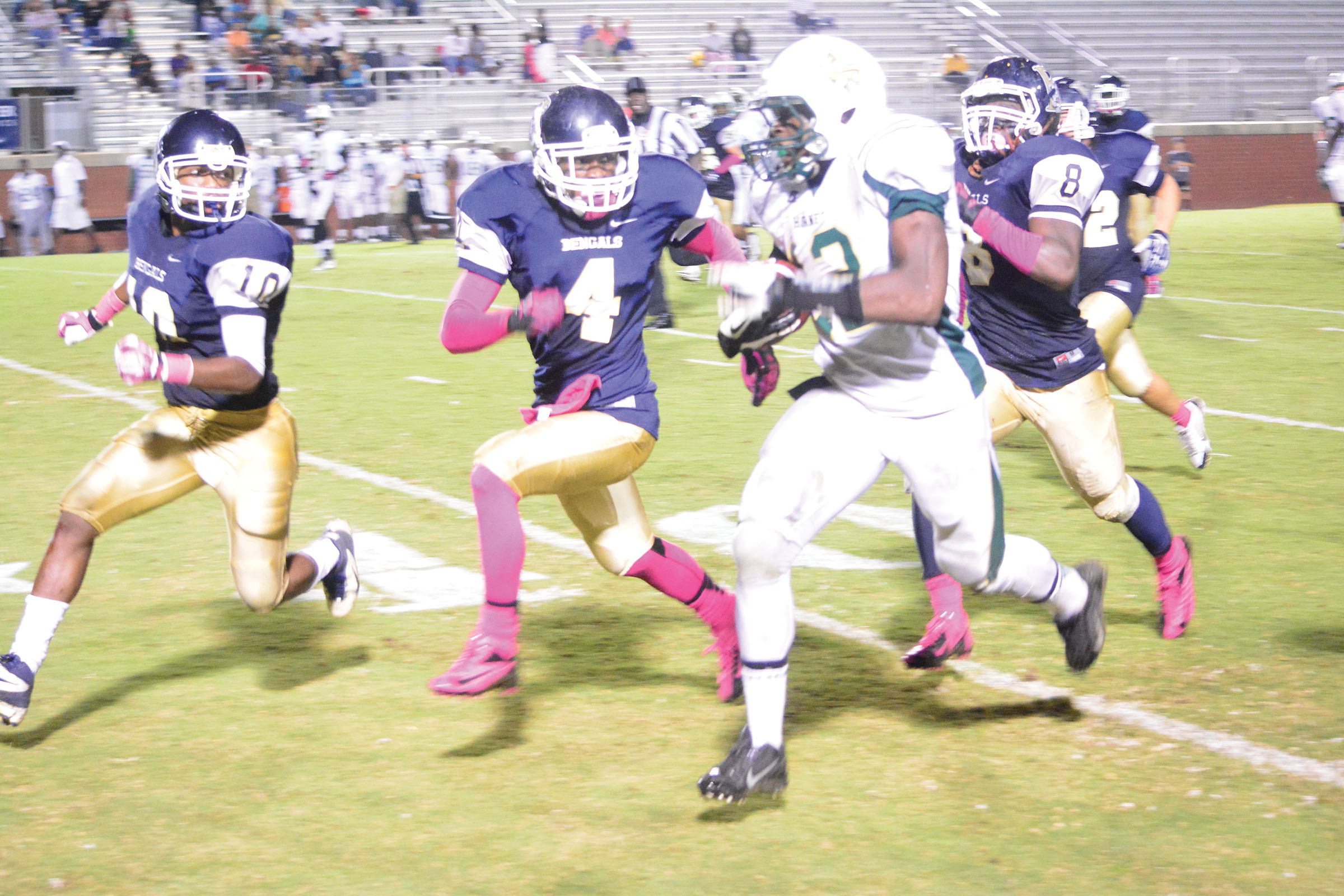Blythewood’s Leo Evans (4), Jalen Williams (8) and Justin Glenn (10) chase down Aiken’s Terrell Lewis. (Photo/Joe Seibles)