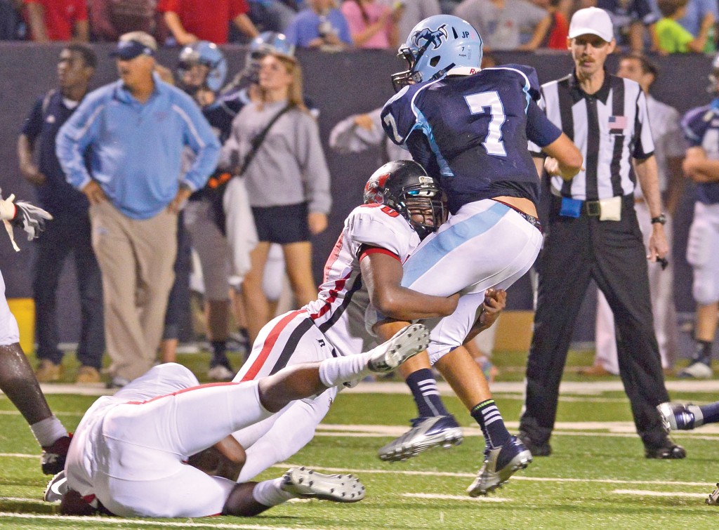 Chapin quarterback Matt Charpia (7) gets the pass off just as Westwood’s Bradley Carter makes contact. (Photo/Ross Burton)