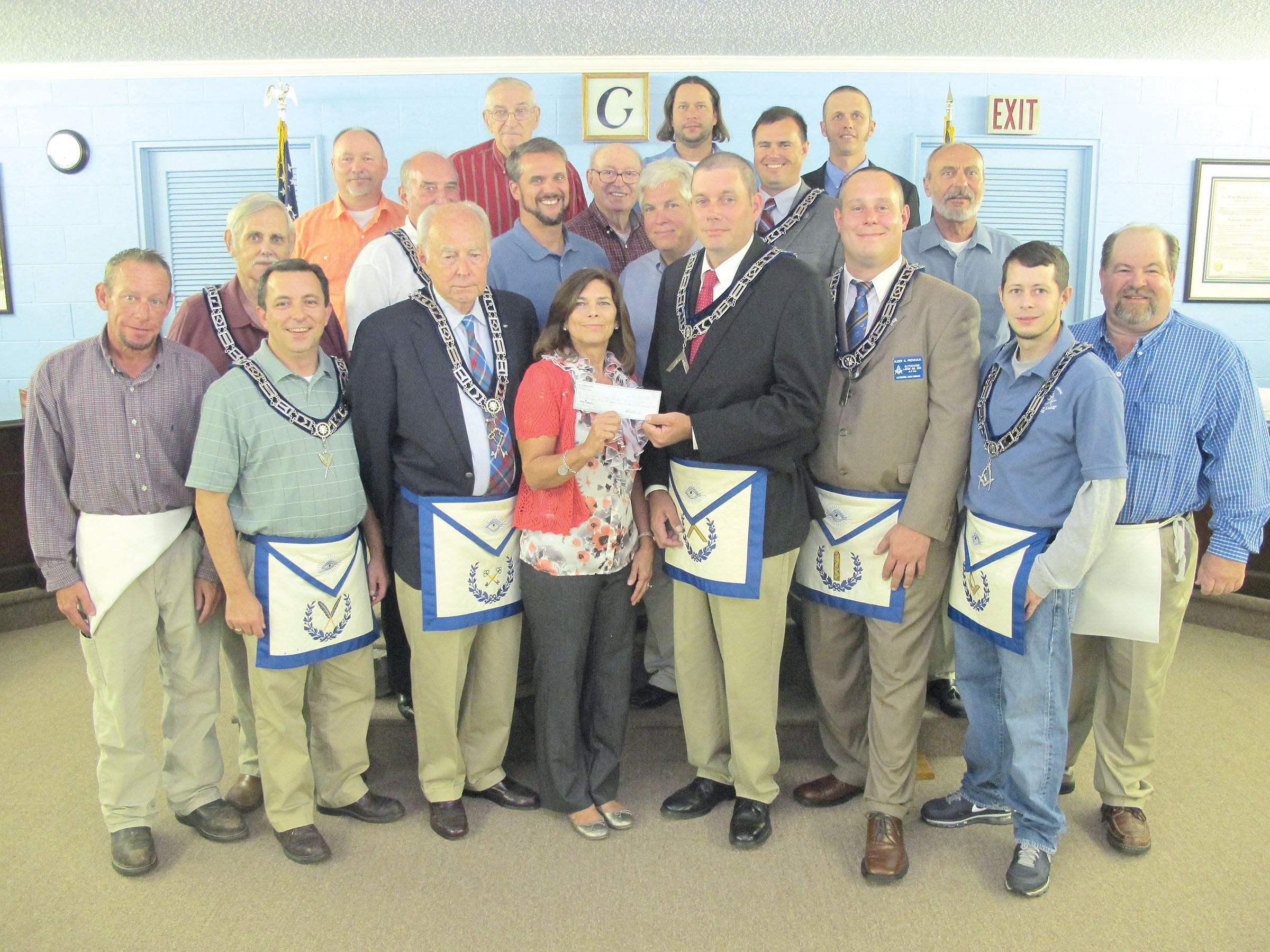 The Blythewood Order of the Masons recently donated $1,500 to the Women’s Ministry at Sandy Level Baptist Church to purchase food supplies for the Backpack Food Program that benefits children in Blythewood schools. Grand Master Allen Hagood, center, presents the check to Linda McGuffin, representing the Women’s Ministry. Front row:  Chris Wages, Ellis Farr, H. D. McLean Jr., McGuffin, Hagood, Alden Provost, Matt Nichols and Neal Ferguson.  Second row: Billy Nestle, Lawrence Stealy, Van Henson, Bobby Loner, Mike Morrison, Brian Cooper and Todd Austin. Back row: Keith Loner, Albert Broach, Gregg Hendricks and Byron Horn.