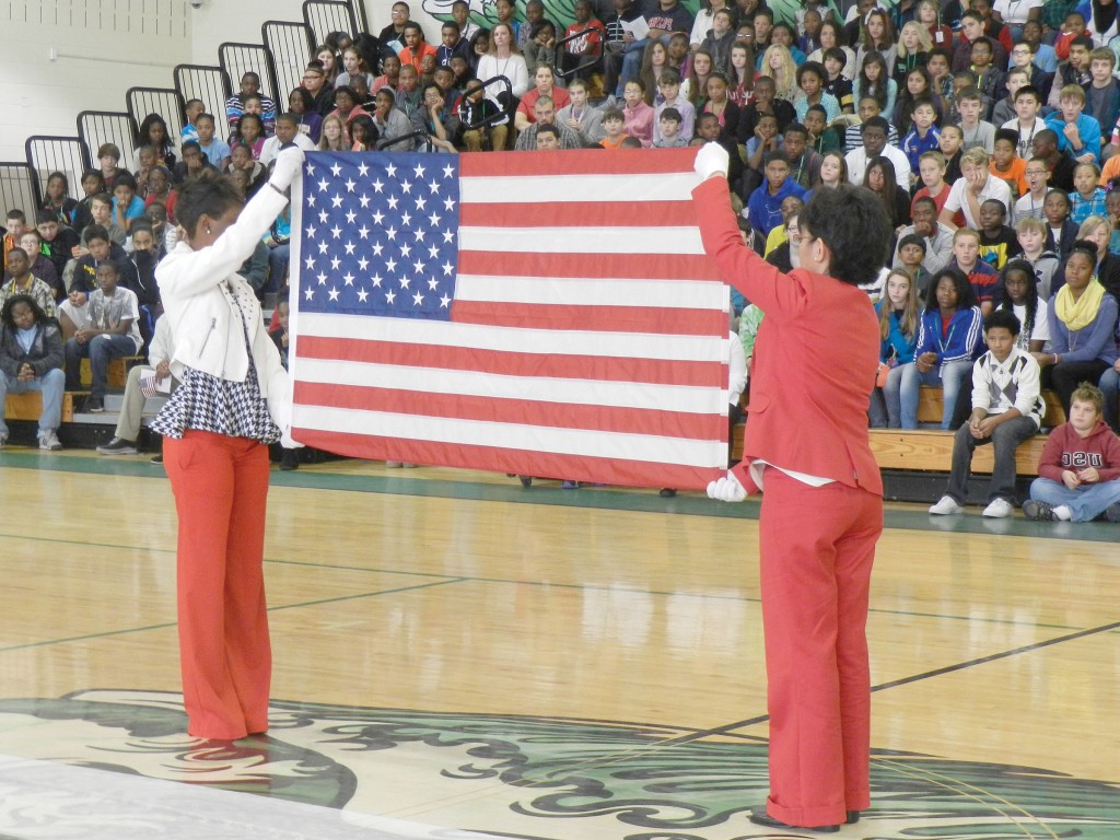 Kelly Mill Middle School teachers Nyisha Williams, left, and Tzarina Salomon display the American flag during a solemn Veteran’s Day program in the school’s gym Monday. A number of schools in Fairfield County and Blythewood honored veterans in ceremonies this week.