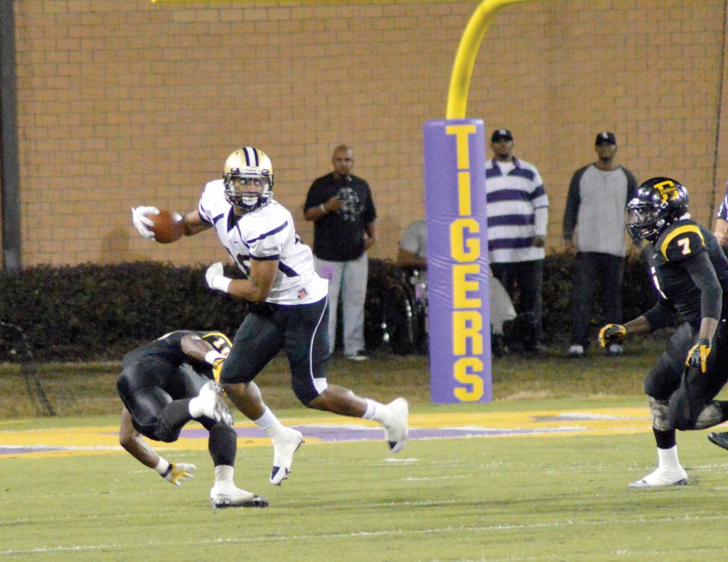 In the shadow of his own goal posts, Fairfield Central’s Larry G. Bell looks for an escape route. (Photo/DeAnna Robinson)