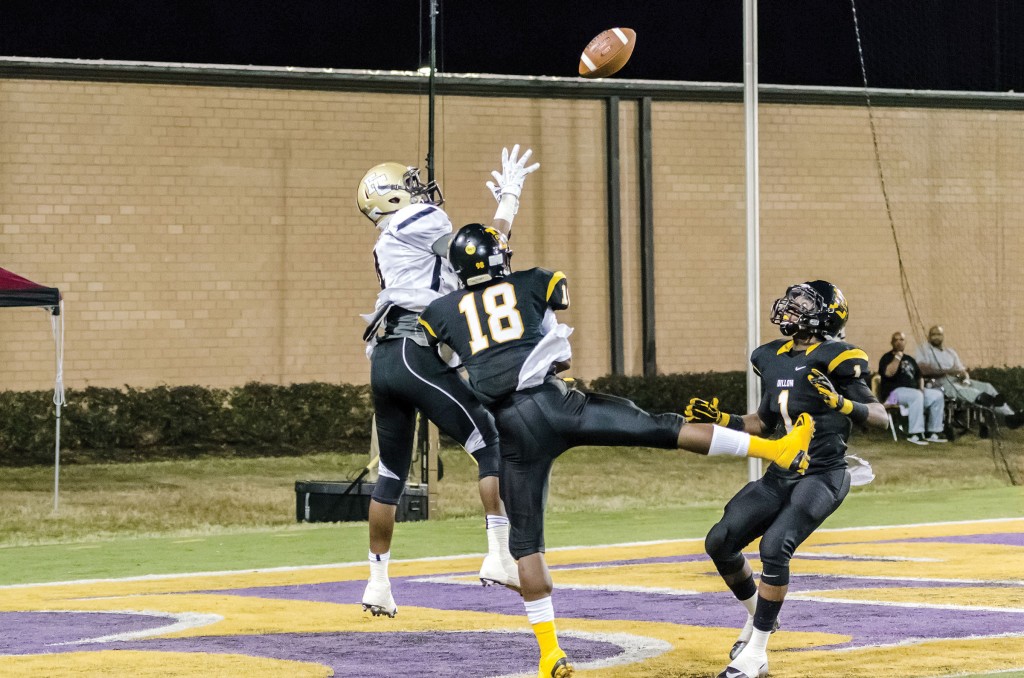 DeAndre Belton’s pass to Kewaun Squirewell would ultimately be picked off by Dillon’s Omar McCollum (1). (Photo/Kristy Kimball Massey)