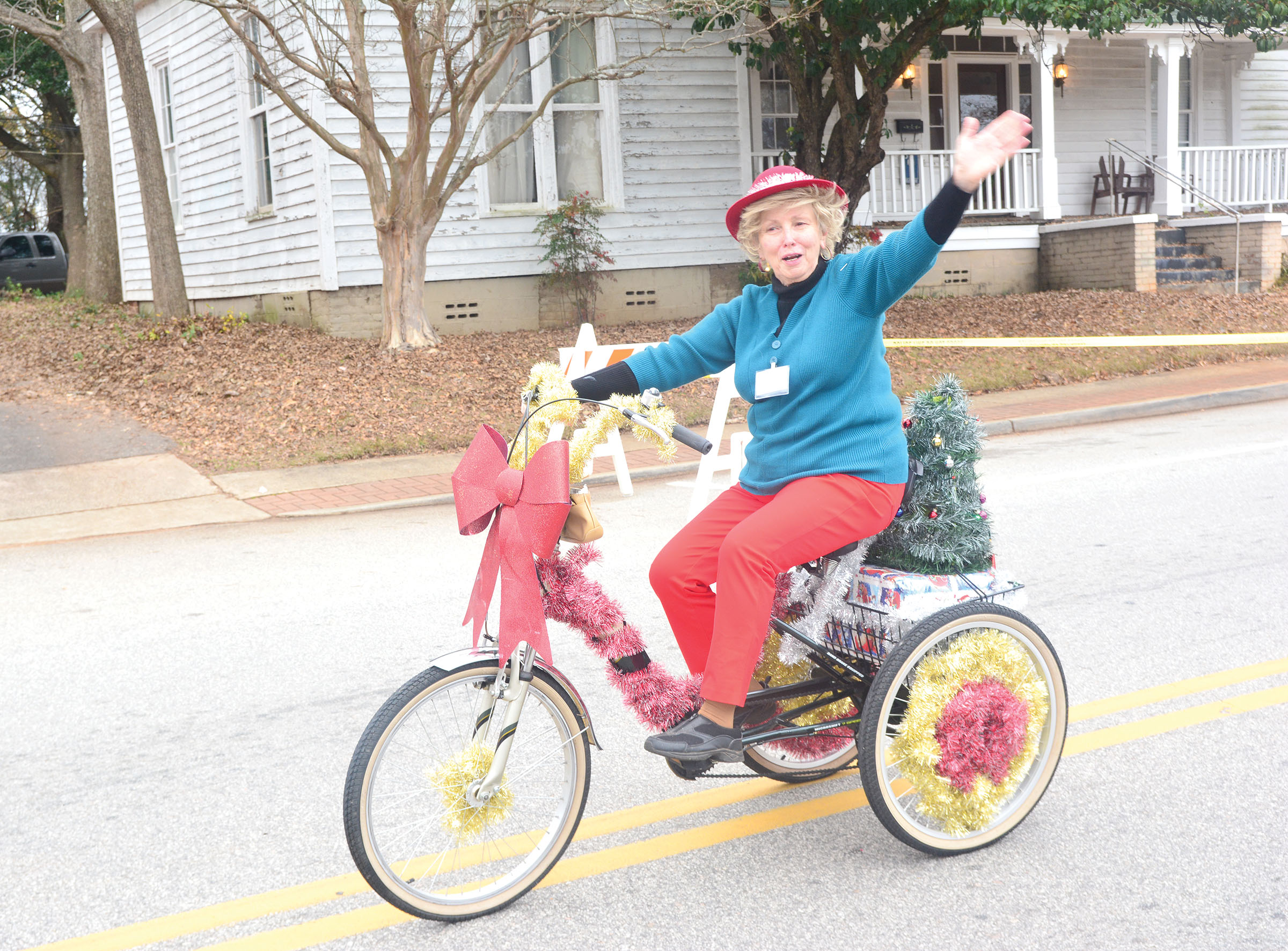 Ridgeway’s Judy Miller, owner of Just Around the Corner, welcomes visitors to Sunday’s annual Christmas parade in her typical festive fashion.