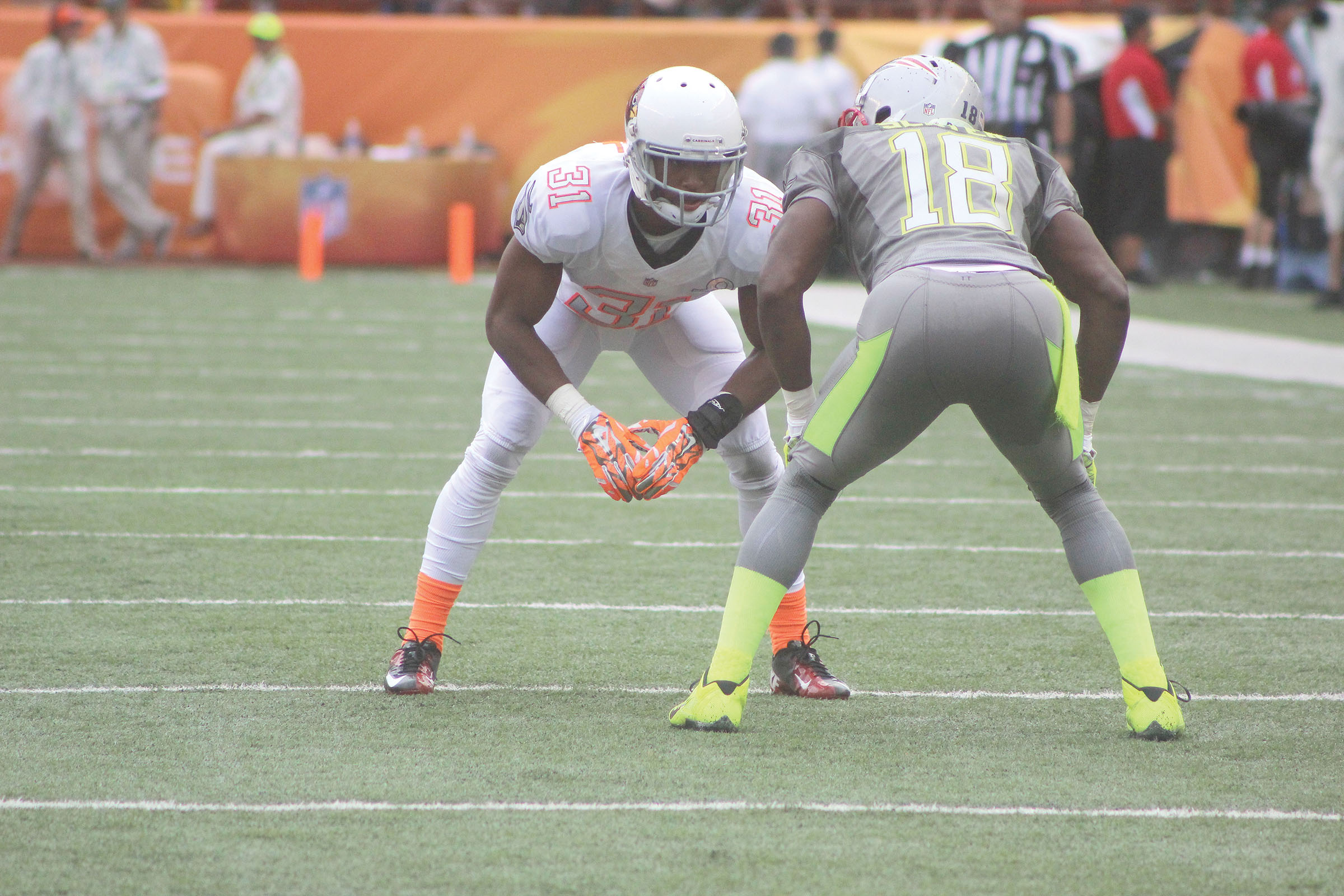 Former Blythewood High School Bengal Justin Bethel (31), now a punt coverage specialist for the Arizona Cardinals, lines up during Sunday’s NFL Pro Bowl against New England’s Matthew Slater. (Photo/Warren Lee)
