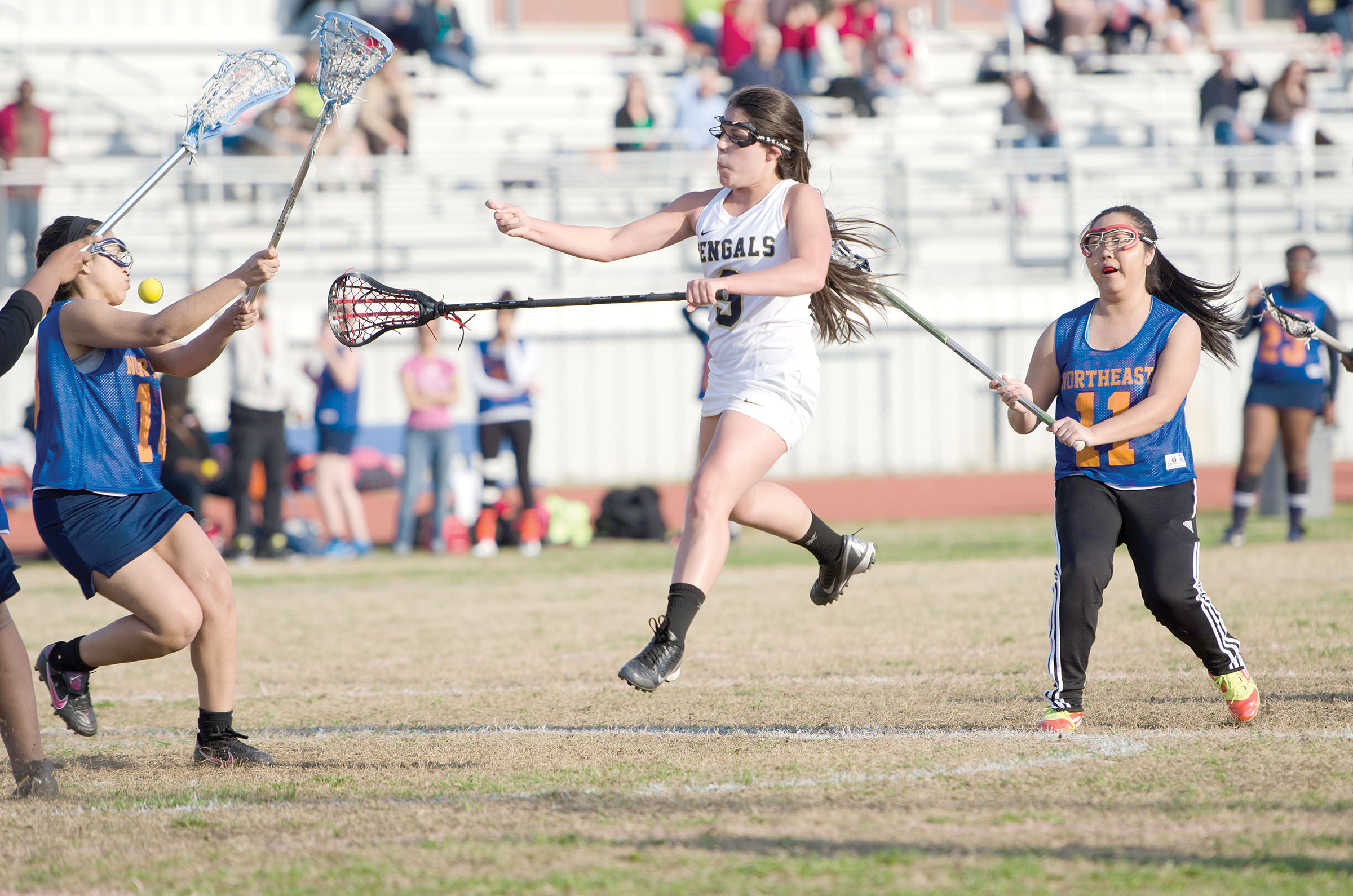Blythewood’s Ashley Cruz (9) flings a pass into the face of a Richland Northeast defender in Monday’s region action. The Lady Bengals dumped RNE 20-6, running their record to 5-3. Blythewood traveled to Clover March 27 and host Bluffton March 28 before hitting the road to Irmo Monday.