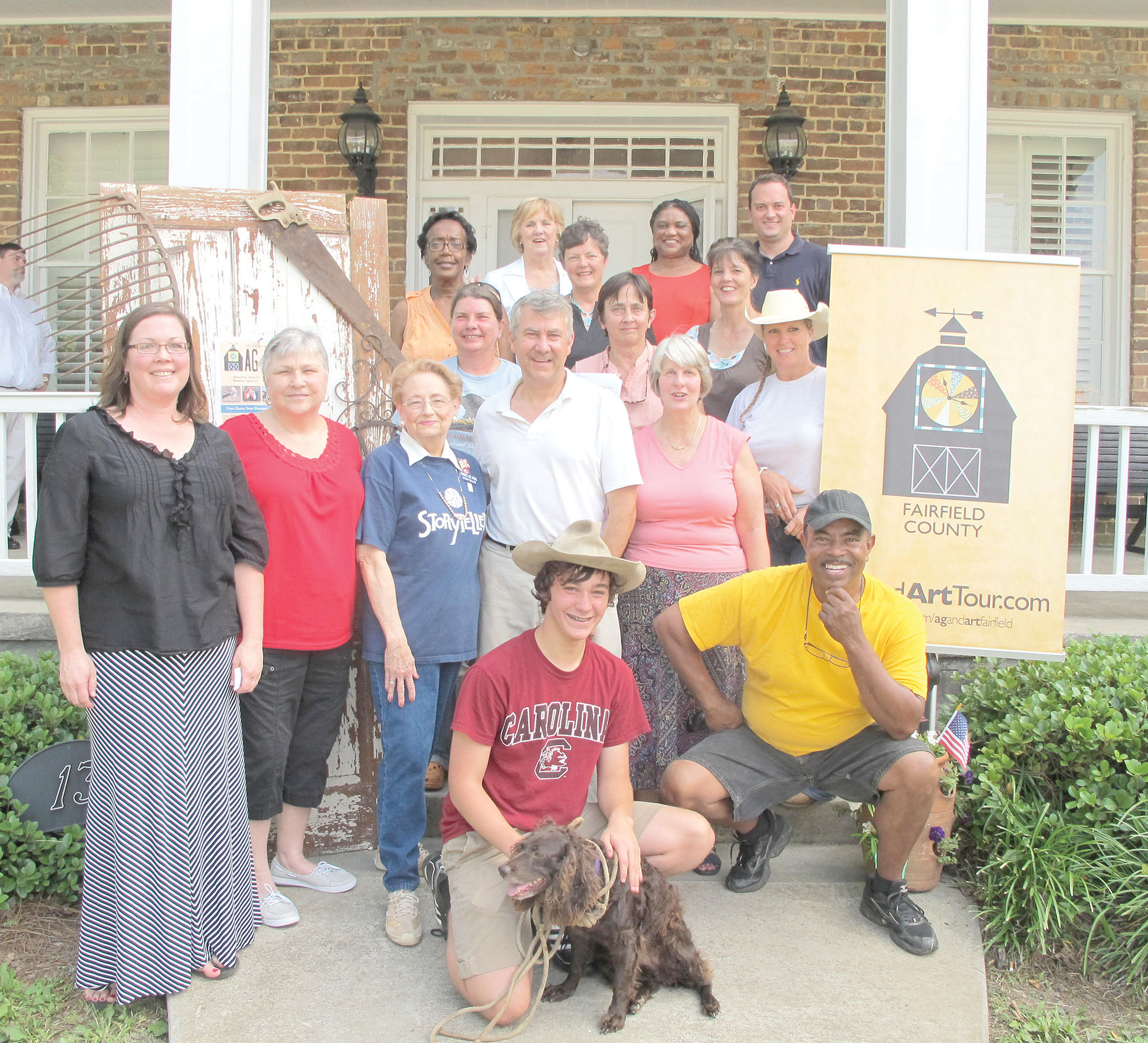 The Kickoff for the 2014 Fairfield County Ag + Art Tour was held in Ridgeway on Tuesday evening and featured a number of the farmers, entertainers and artists who will participate in the tour next weekend, June 21 and 22. Gathered on the steps of the Century House in Ridgeway are: Graham Hall with his dog Sugar (Magnolia Lodge) and Ernest Manning (Fairfield Farmer’s Market.) First row: Mac Russell (Fairfield Farmer’s Market), artist Susan McManus, storyteller Frankie O’Neal, musician Tom Hall and Denise Jones (Chairwoman of Fairfield County Chamber of Commerce.) Second row: ?????? (????), Pelham Lyles (Fairfield Museum), Phyllis Dinkins (The Old Station) and Lori Freeman (Our Barn.) Third row: Addell Pauling (Herb Grower), Terry Vickers (President of the Fairfield Chamber of Commerce), Katherine Doty (Doty Farm), Strauss Shiple (Olde English Tourism District) and Ben Boyles (Clemson Extension).
