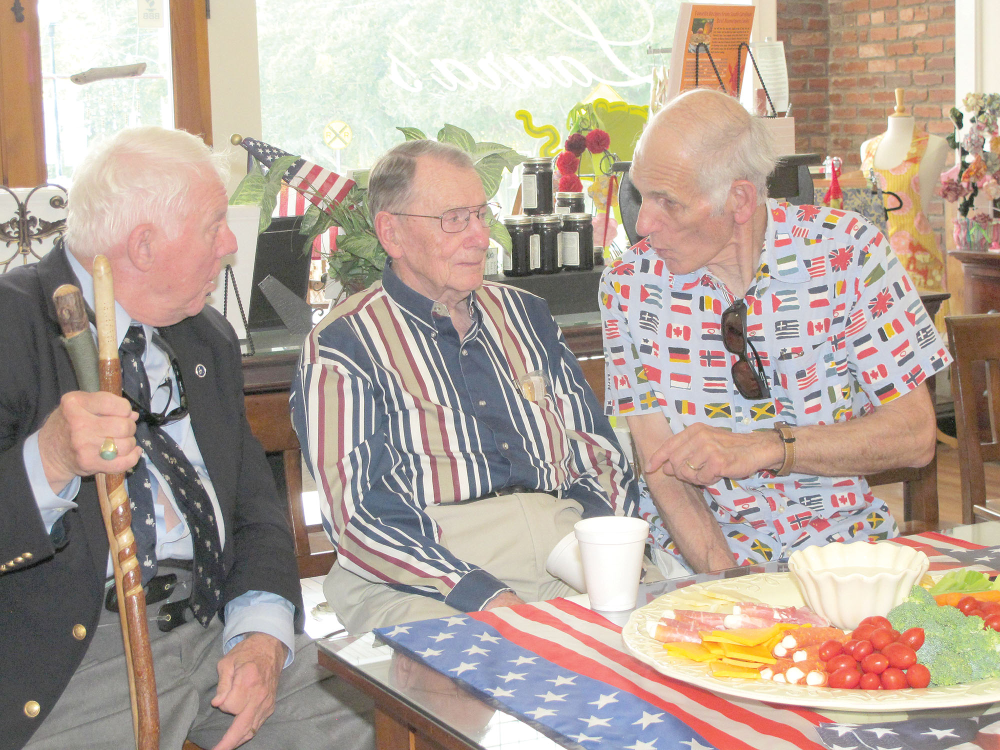 Vietnam War veteran Nelson Lacy of Ridgeway, World War II Navy veteran Doug Pender of Blythewood and Vietnam War veteran Dick Daeger of Blythewood share their combat and service experiences during a reception following last Friday’s D-Day remembrance and veterans’ parade in Ridgeway.