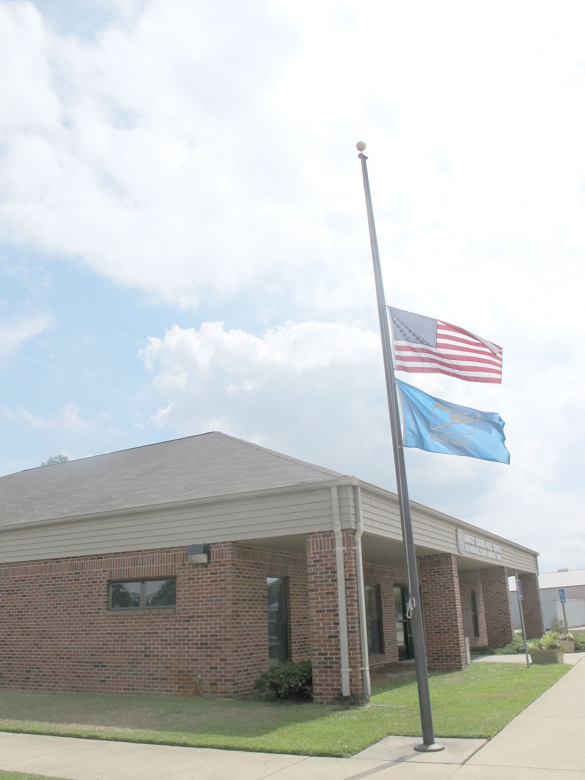 The Blythewood Post Office flew its flag at half staff last week in honor of former Postmaster Jim Jeffcoat who died July 7. Jeffcoat served as Postmaster for 29 years, retiring in October 1999.