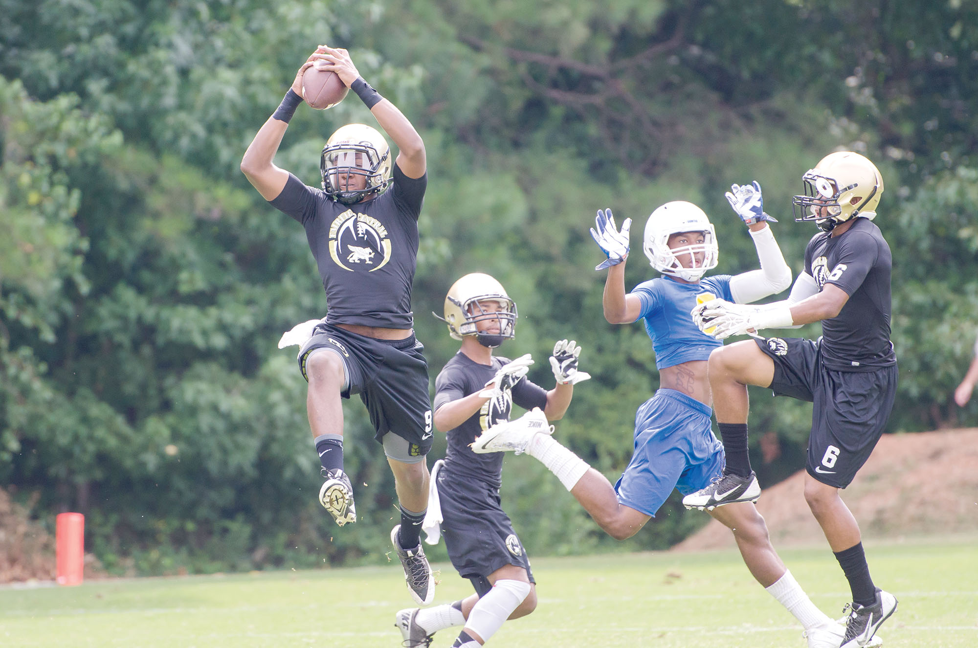Fairfield Central’s Maurice Pauling (9) intercepts a Sumter pass as Shadarius Hopkins (6) and Randanion Sampson converge on the Gamecock receiver in Saturday’s 7-on-7 tournament at Irmo High School. The Griffins were knocked out in the semifinals by the eventual tournament champion, Orangeburg-Wilkerson. “We did a lot better than I thought we would,” Griffin head coach Demetrius Davis said. “We got better, and that’s the most important thing.”