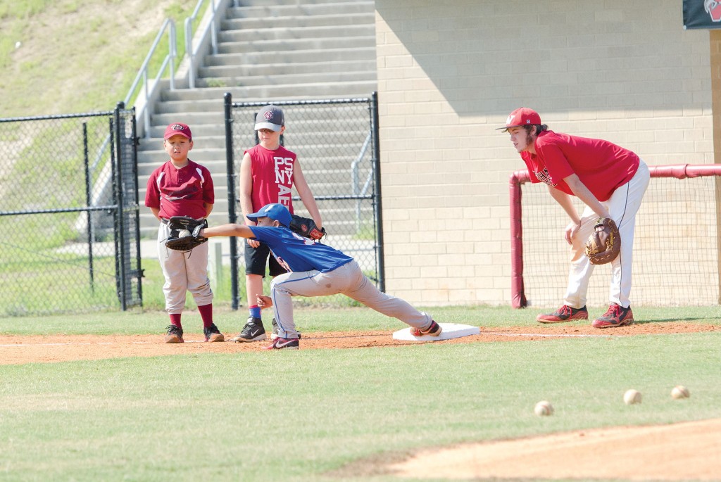Alex Guess makes the stretch at first as Landon Caulder and Kenshin Byun take note and Redhawk first baseman Jackson Evans dishes out a few pointers.