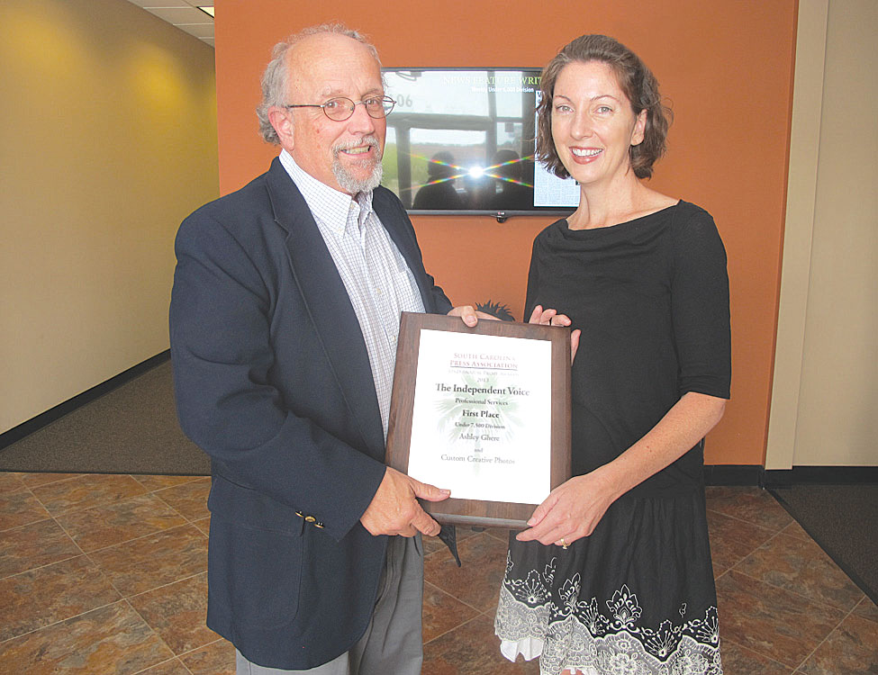 Bill Rogers, Executive Director of the S.C. Press Association (left), congratulates Voice graphics designer Ashley Ghere on one of her 10 first place awards (including Best in Show) in this year’s PALMY advertising contest.