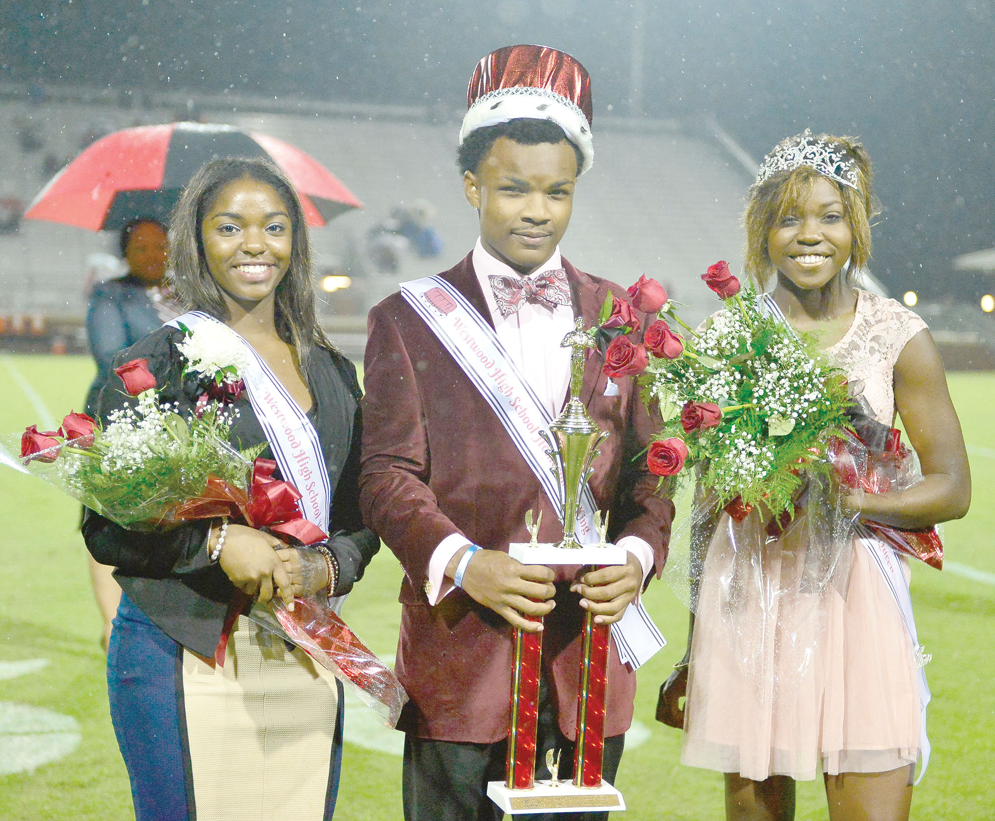 Homecoming King and Queen contestants braved some brutal weather at Westwood High School Friday night, but the downpour didn’t dampen their spirits as the student body crowned Kelsey Briggs (right) Queen, Hjallon Syrkett King, with Raven Garrick-Duckett filling out the Court as runner-up.