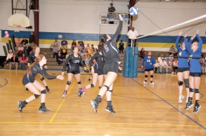 RWA senior Emily Brigman power hits from the right side to score a kill for the Lady Eagle team. (Photo/Martha Ladd)