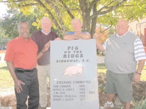 Pig on the Ridge organizers Donald Prioleau, Tom Connor, Henry Dixon and Rufus Jones show off the new monument to Ridgeway’s annual festival, which will happen again this weekend. For a complete schedule of events, see their ad on page 20. (Photo/Barbara Ball)