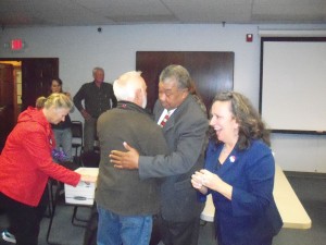 Winnsboro attorney Debra Matthews (right) celebrates as District 3 challenger Walter Larry Stewart (second from right) receives congratulations from Vernon Plyant following the Election Commission’s ruling Monday that a new election would be necessary between Stewart and incumbent Mikel Trapp for the District 3 County Council seat. (Photo/James Denton)