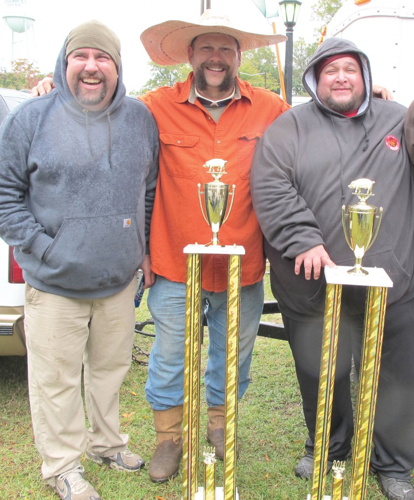 The rain may have dampened the Pig on the Ridge festival last weekend, but not the barbecue . . . it was great, as usual. Show here are the barbecue winners for the professional division: Tony Crout (fifth place) of Blythewood’s Doko Smoke, Gene Culberson (first place) of Backwoods BBQ and Ley Morris (second place) of Blowing Smoke. And Crout’s cooking rig sort of won first place since it was used by Culberson’s cook crew to turn out Backwood’s winning entry.