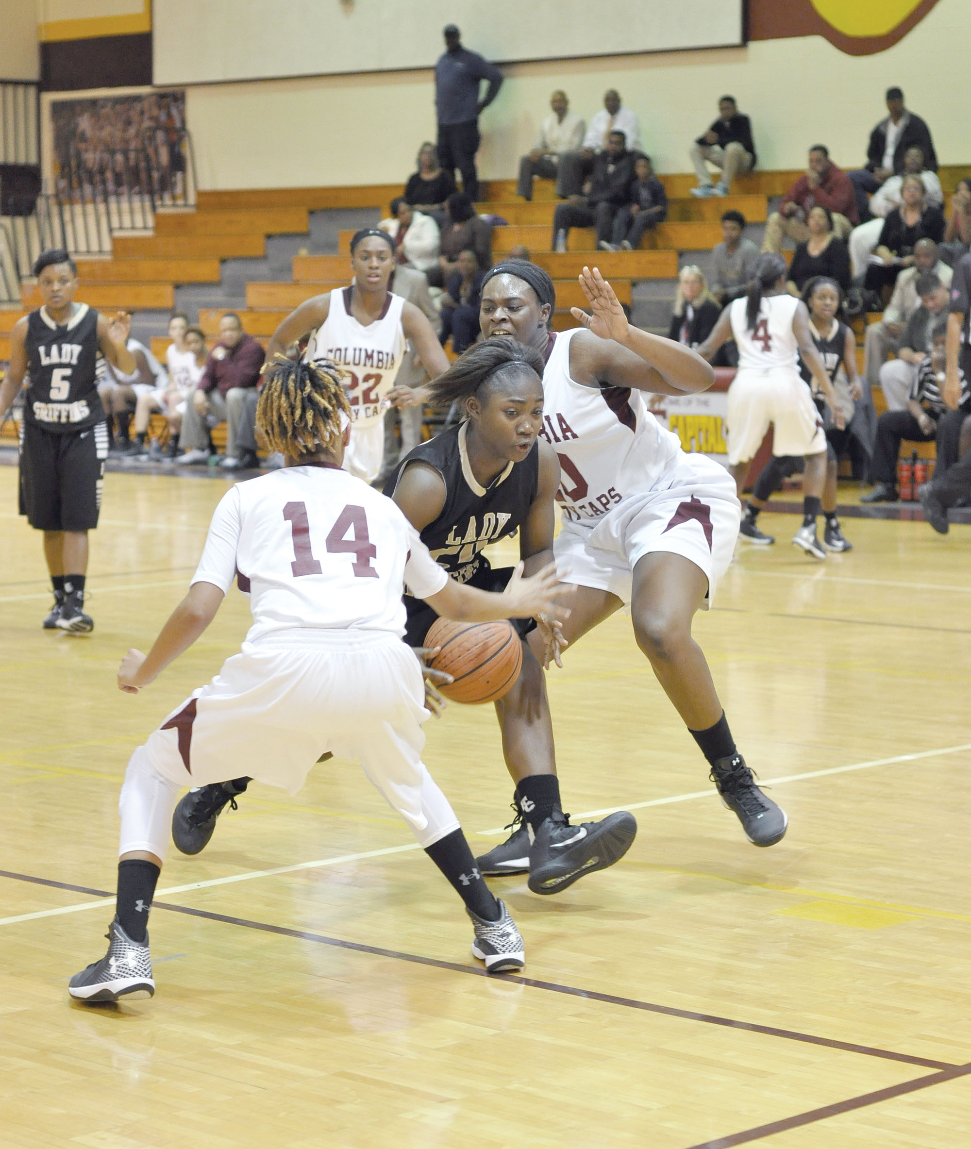 COLUMBIA – The height of Columbia’s Ruth Washington and Wynter Straw was too much for the Fairfield Central girls to overcome Tuesday night. Washington scored 12 points and Straw scored 10 in addition to pulling down 10 rebounds as the Lady Capitals stopped the Lady Griffins 51-38 at the Columbia High gym.
