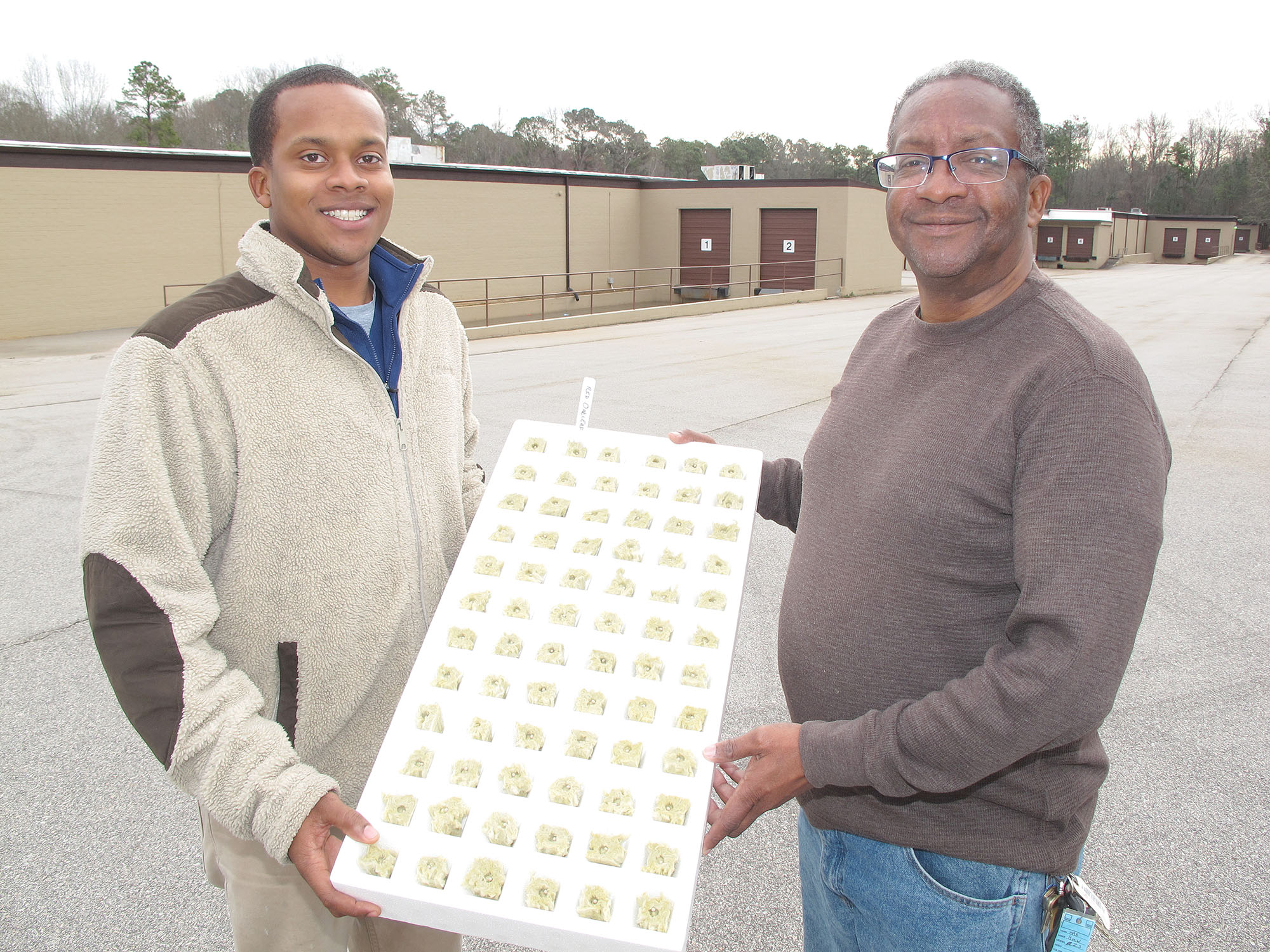 Chip Harriford, (right) manager of operations of Royal Greens, and his son, Scott, show off a freshly planted seed tray of lettuces in front of the 176,000-square-foot Charm building in Ridgeway where they will soon open to the public what will become the national headquarters of a wholesale/retail hydroponic growing operation.