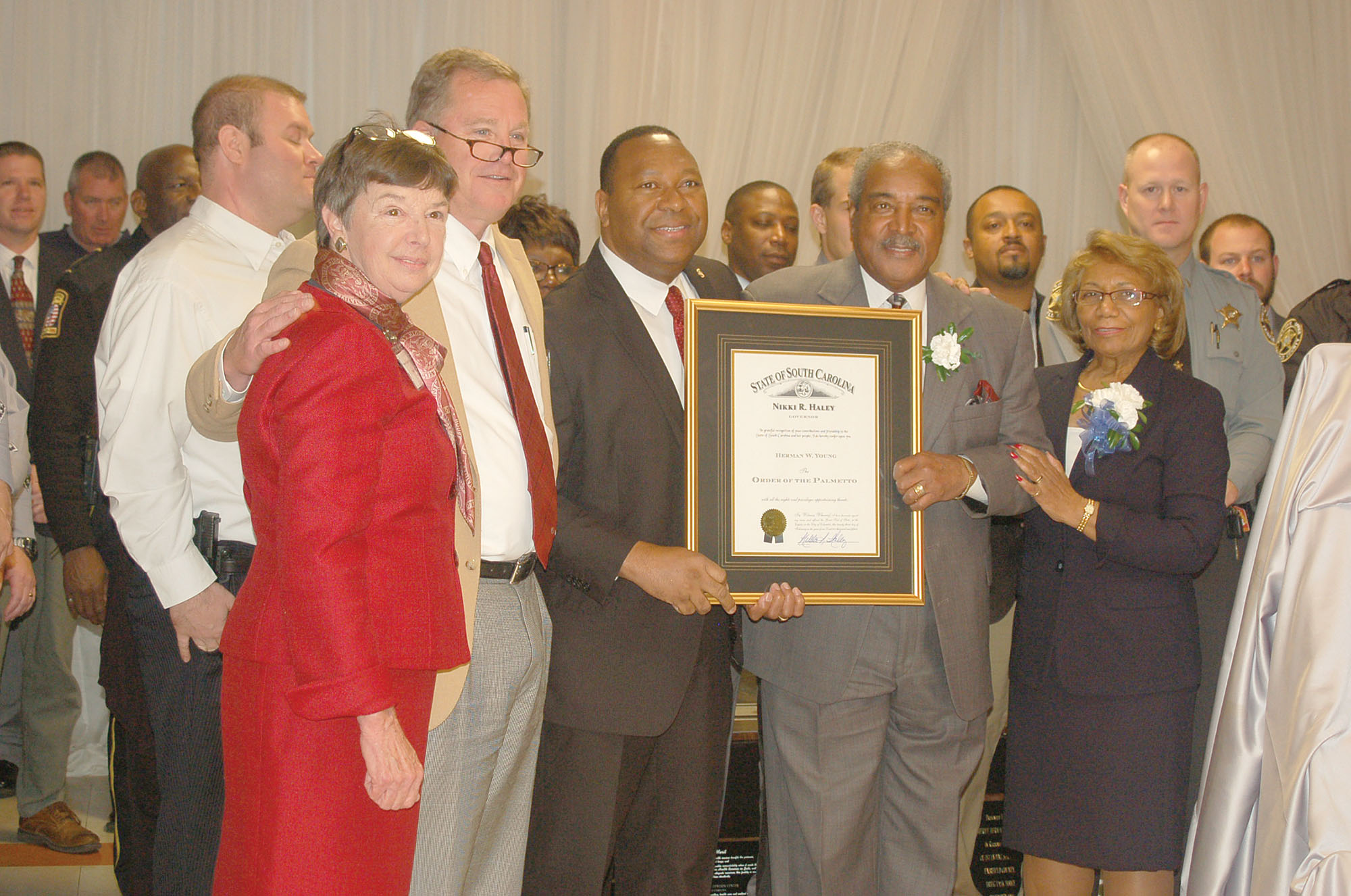 Former Fairfield County Sheriff Herman Young (second from right) was honored Monday night with the S.C. Order of the Palmetto, the state’s highest award, for his 52 years in law enforcement, 22 of which were spent as Fairfield County Sheriff. With Young are State Rep. MaryGail Douglas, State Sen. Creighton Coleman, Director of S.C. Department of Public Safety Leroy Smith and Young’s wife, Peggy.
