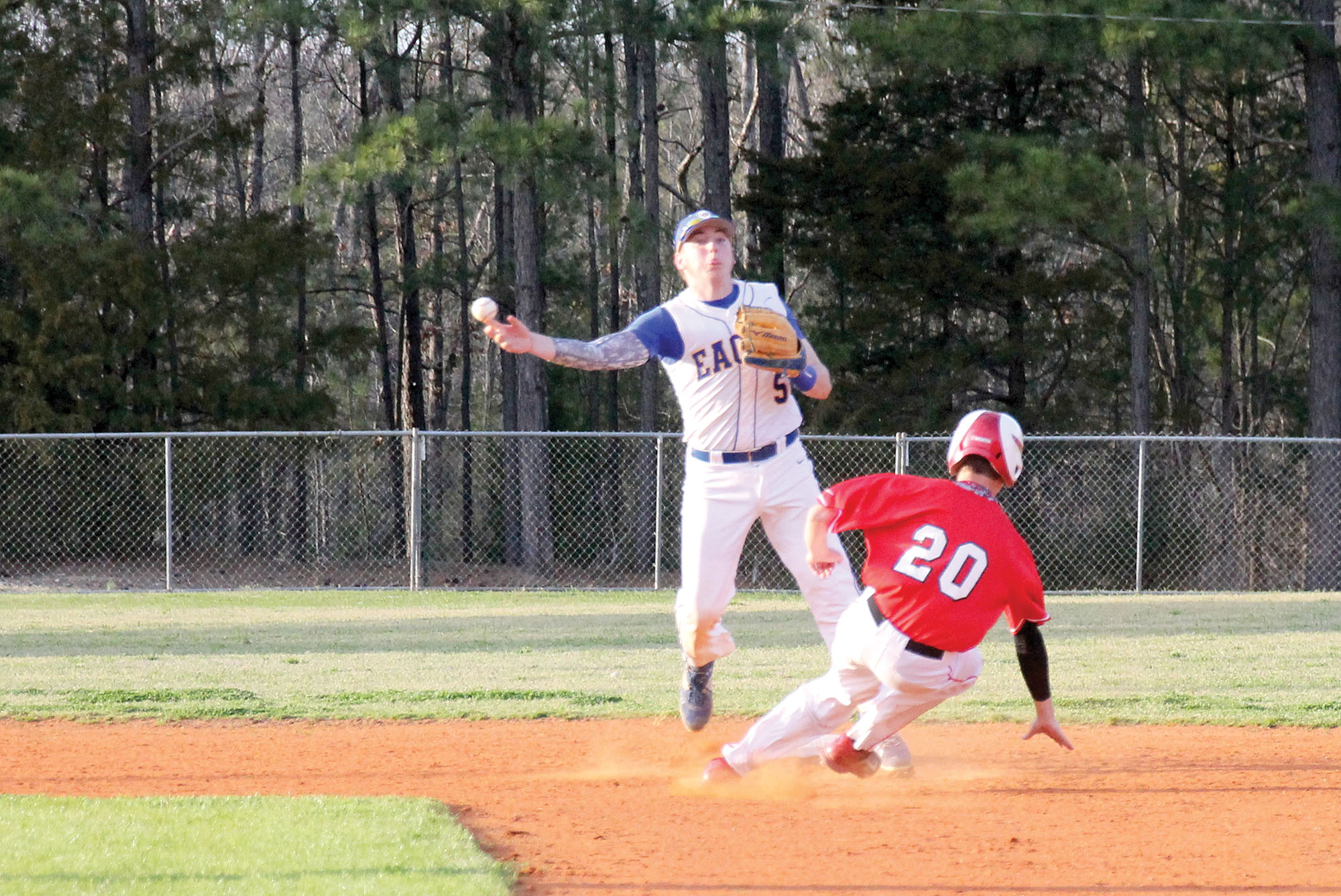 RWA shortstop Cameron Cooper steps on the bag, avoids the slide and turns the double play against Great Falls. (Photo/Martha Ladd)