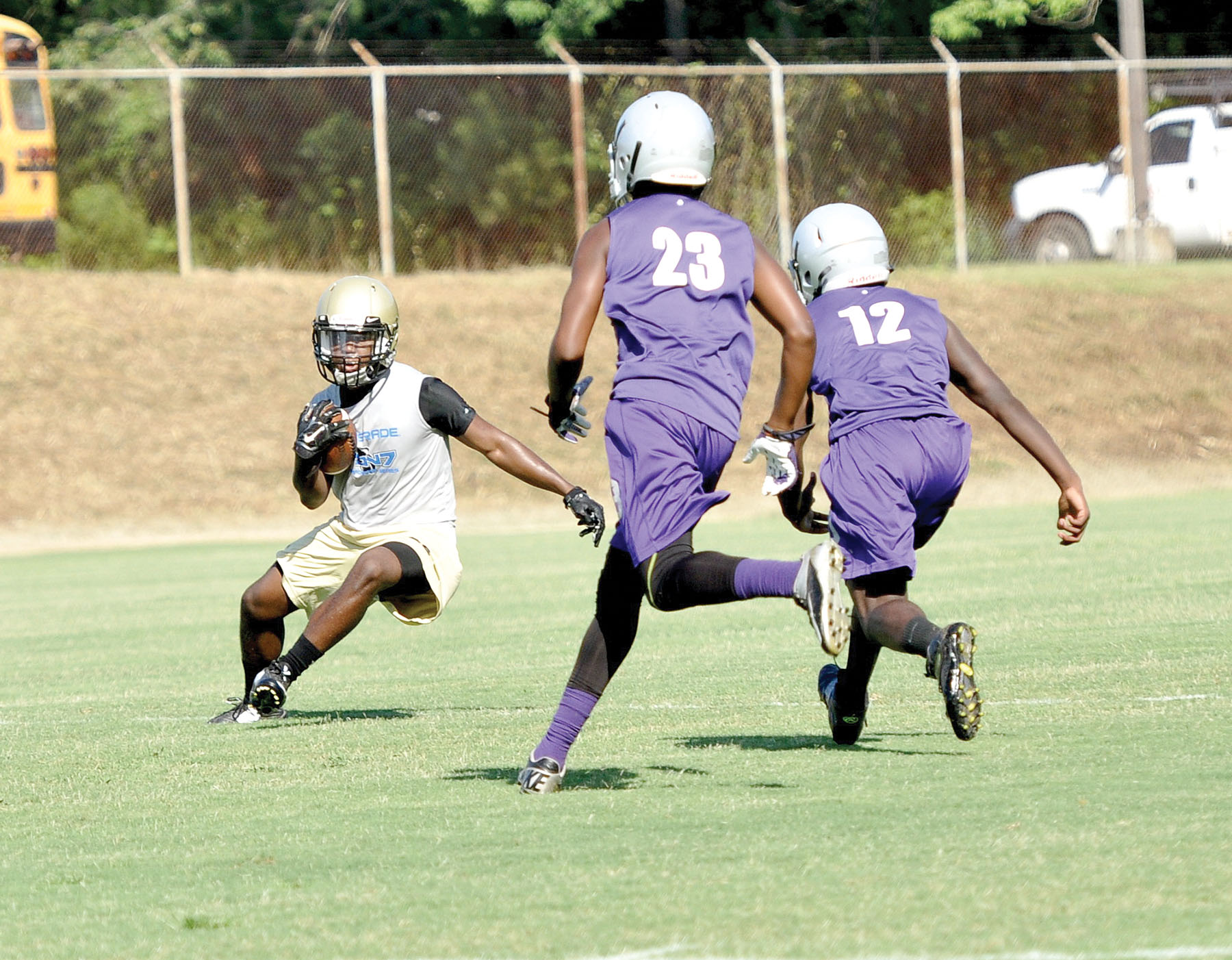 Rising Fairfield Central junior Jerrell Suber-Oneal takes a pass during last Saturday’s 7-on-7 tournament at Irmo and considers two Ridge View defenders closing in. The Griffins were eventually knocked out of play by Irmo, who went on to take the trophy. “We got some good work in,” Griffin head coach Demetrius Davis said. “We’re young, and we’re not very deep, but we’re getting better.” Blythewood High School is getting their work in over the summer as well. This weekend, the Bengals are at Olympic High School in Charlotte for the Cam Newton 7-on-7 (8 a.m. – 5 p.m.); at Presbyterian College on July 8, 9 a.m. – 9 p.m.; at Rock Hill High School on July 16, 9 a.m. – 3 p.m.; and will host the FCA 7-on-7 on July 24, 9 a.m. – 3 p.m. Westwood High School, meanwhile, hosts tournaments on July 9 and July 23, both at 5:30 p.m.