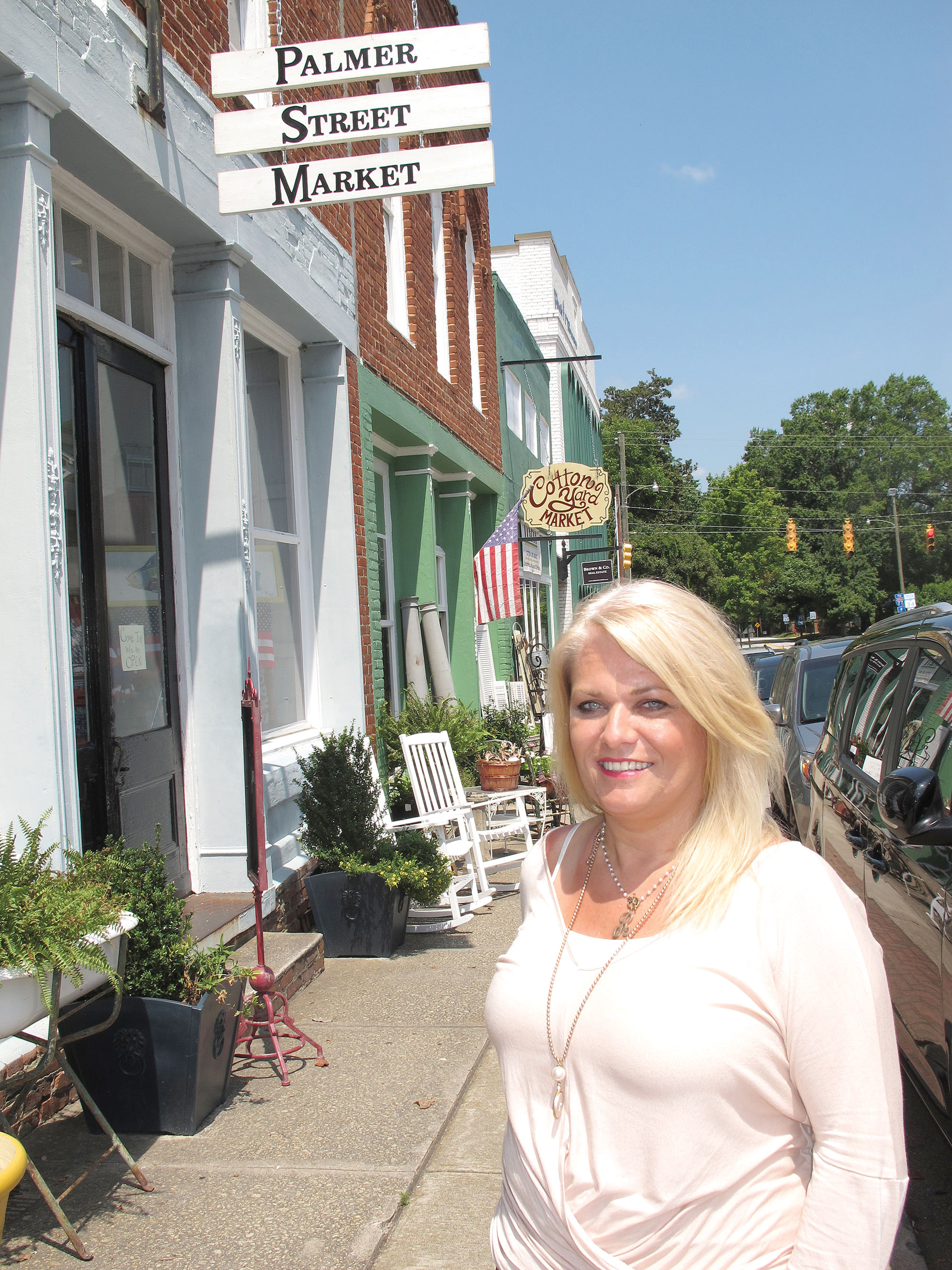 Instead of a fruit basket turnover, Ridgeway is having a business turnover. Robbie Martin, standing in front of her home décor shop and art gallery, The Palmer Street Market, is purchasing the consignment business next door, The Cotton Yard Market, from Karen Sieling, who will be opening the Ridgeway Station Café on Dogwood Avenue. Martin, who will continue to be behind the counter at The Palmer Street Market, said Joyce Hanes and Roger Herring who currently manage The Cotton Yard Market will continue to do so. Shopping hours for both shops are Tuesday – Saturday, 10 a.m. – 5 p.m. and Sunday, 1-5 p.m.