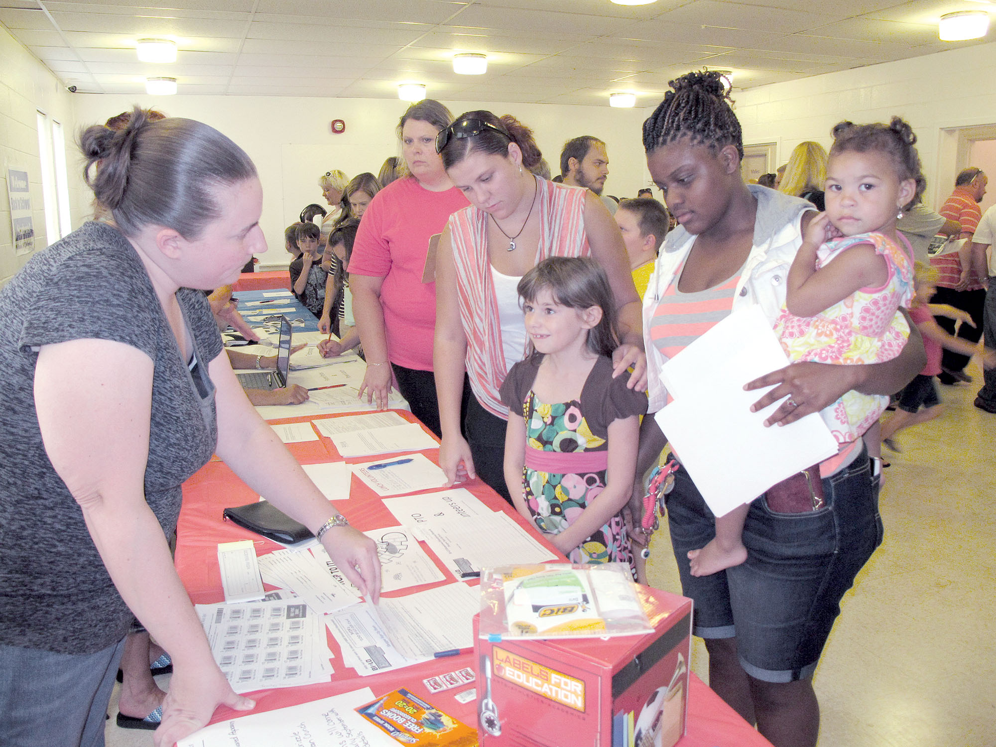 About 157 students showed up with their families last week to enroll for classes at the Midlands Stem Institute in Winnsboro. The school’s PTO secretary, Tasha Hollis, left, offers enrollment forms to Brittany Johnson and her daughter Cheyenne, 8. Kivera Jackson dropped by to check out the school for possible later enrollment for her daughter, Bella, 1. The charter school, which offers free tuition, is located at 112 Crane St. in Winnsboro.