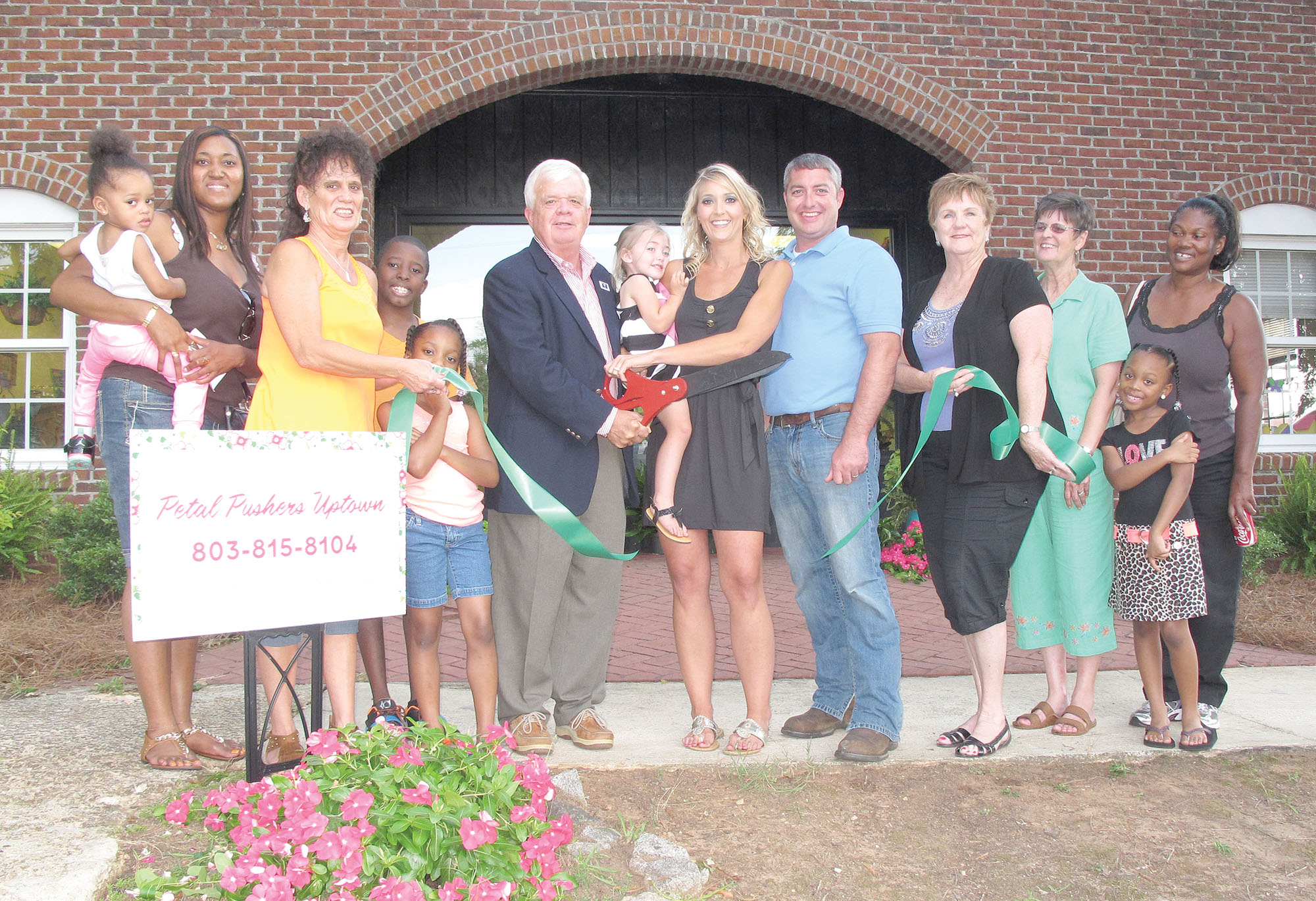 The Fairfield Chamber of Commerce held a ribbon cutting last week for Petal Pushers Uptown. The florist, owned by Christina Richardson, recently moved to 123 E. Washington St. (behind the clock) in Winnsboro. Holding the ribbon on the left is Pauline Marthers and on the right is Terry Vickers, president of the Chamber. Cutting the ribbon are Winnsboro Mayor Roger Gaddy, Richardson, holding her daughter, Paisley, and Richardson’s husband, Jeremy.
