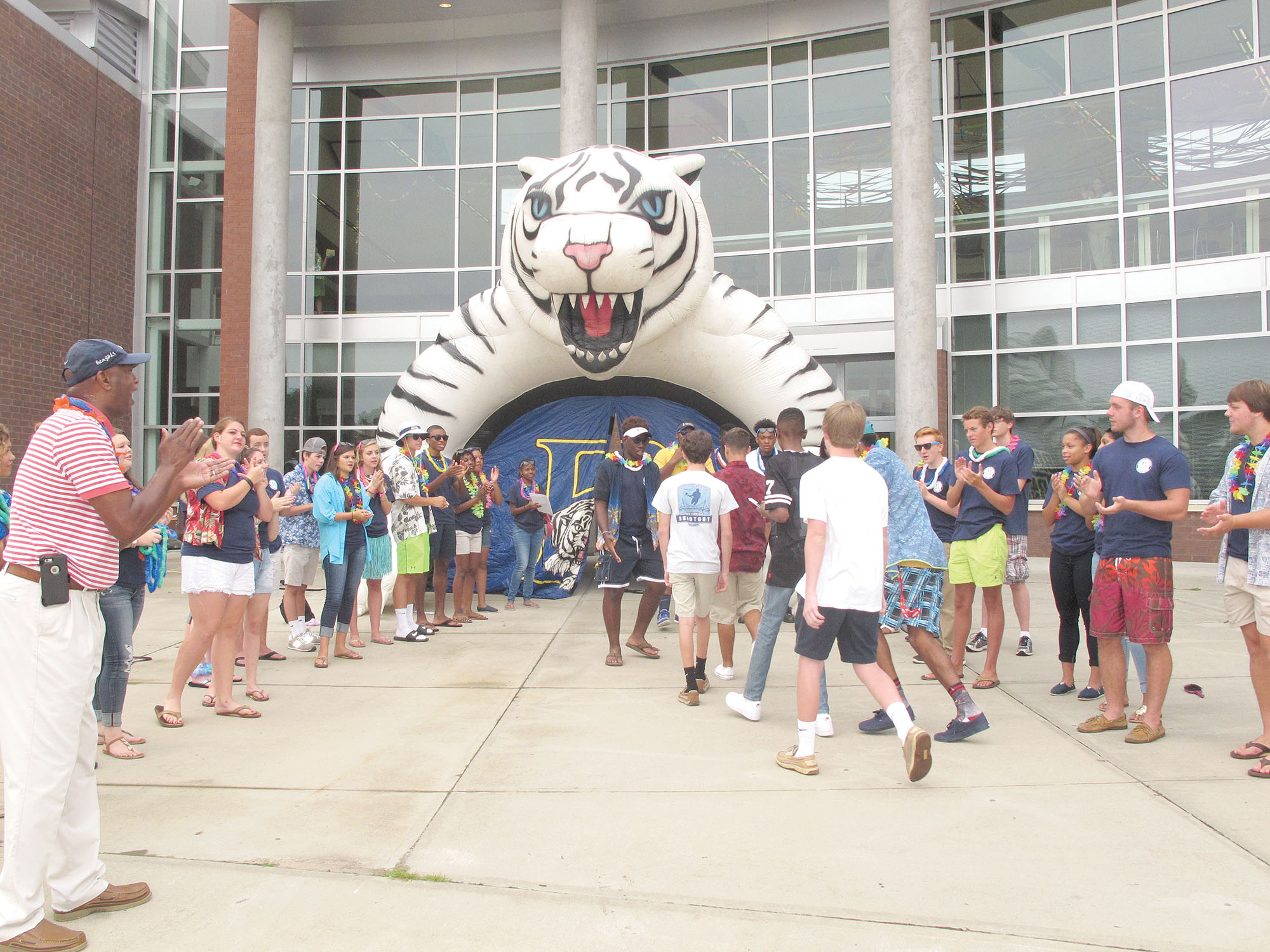 The first day of school came a day early for freshmen at Blythewood High School as they were invited to an abbreviated ‘first day’ on Tuesday before the official opening of Richland 2 schools on Wednesday. The theme for the day, which was far more fun than most first days of school, was a ‘60s beach bash. A huge Bengal tiger and two rows of upperclassmen led by Athletic Director Vince Lowry, left, welcomed the newcomers with cheers, applause and high-five’s. Accompanying parents were turned back at the Tiger as Lowery shouted ‘Welcome to the world!’ to arriving freshmen.