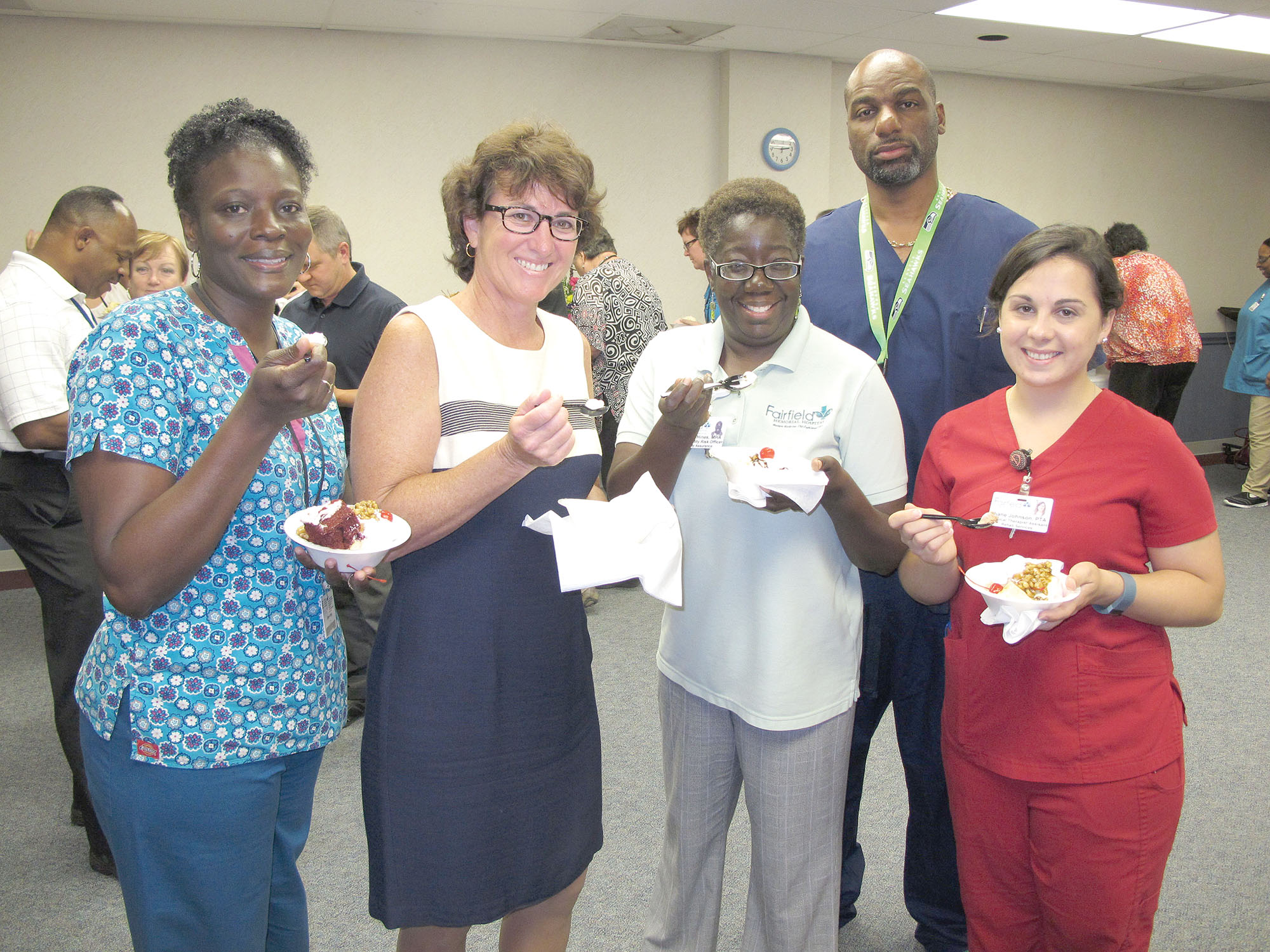 The new CEO of Fairfield Memorial Hospital, Suzanne Doscher (second from left), was welcomed to her new post by the hospital’s employees with an ice cream social at the hospital last week. Joining her in enjoying banana splits and ice cream sundaes are: Diana Kelly, CAN Nursing Services; Darlene Hines, Quality Coordinator; Michael Smith, Technologist in Radiology and Diane Johnson, Physical Therapy Assistant in Rehab Services.