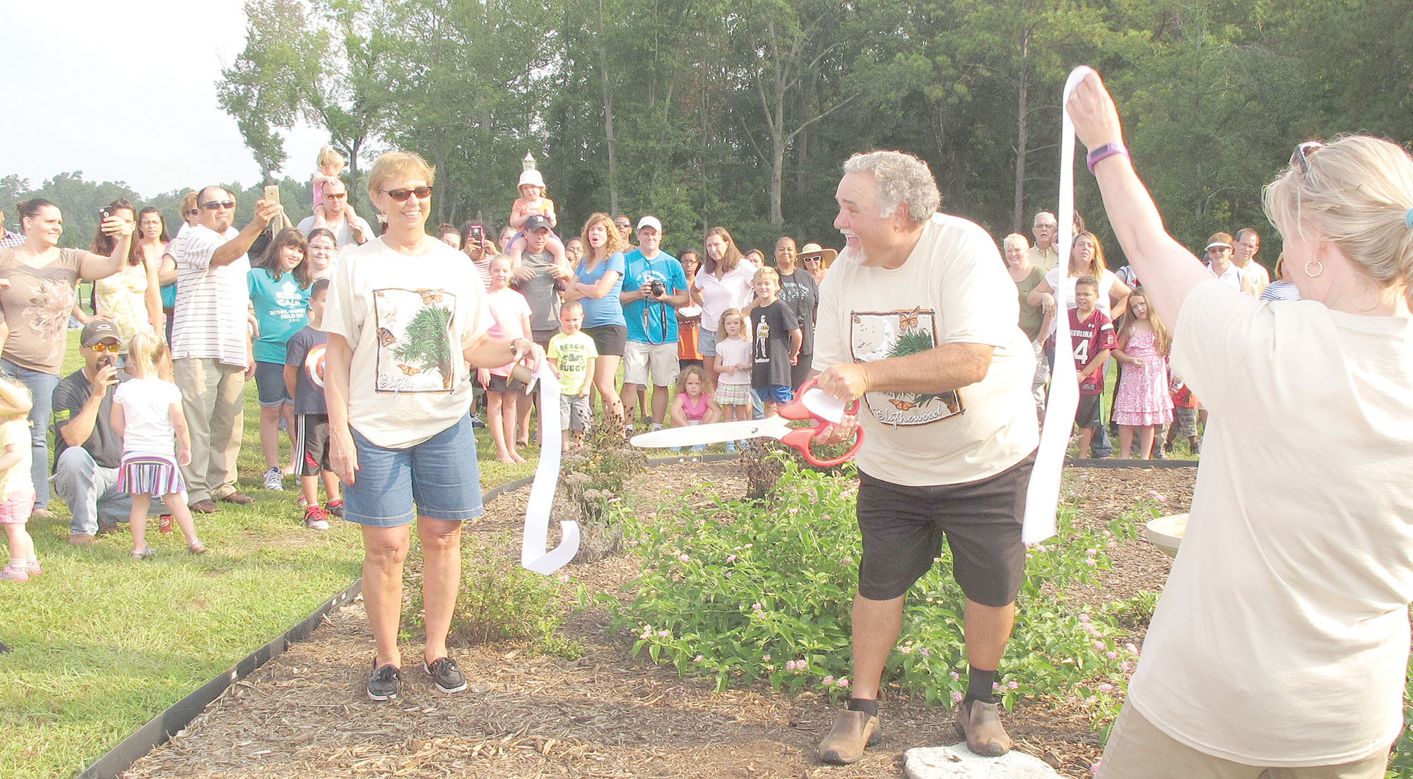 Blythewood Mayor J. Michael Ross cuts the ribbon for the opening of the town’s Butterfly Festival on Saturday. Holding the ribbon are festival organizer Jean Bell, left, and Martha Jones, Director of Bravo Blythewood.