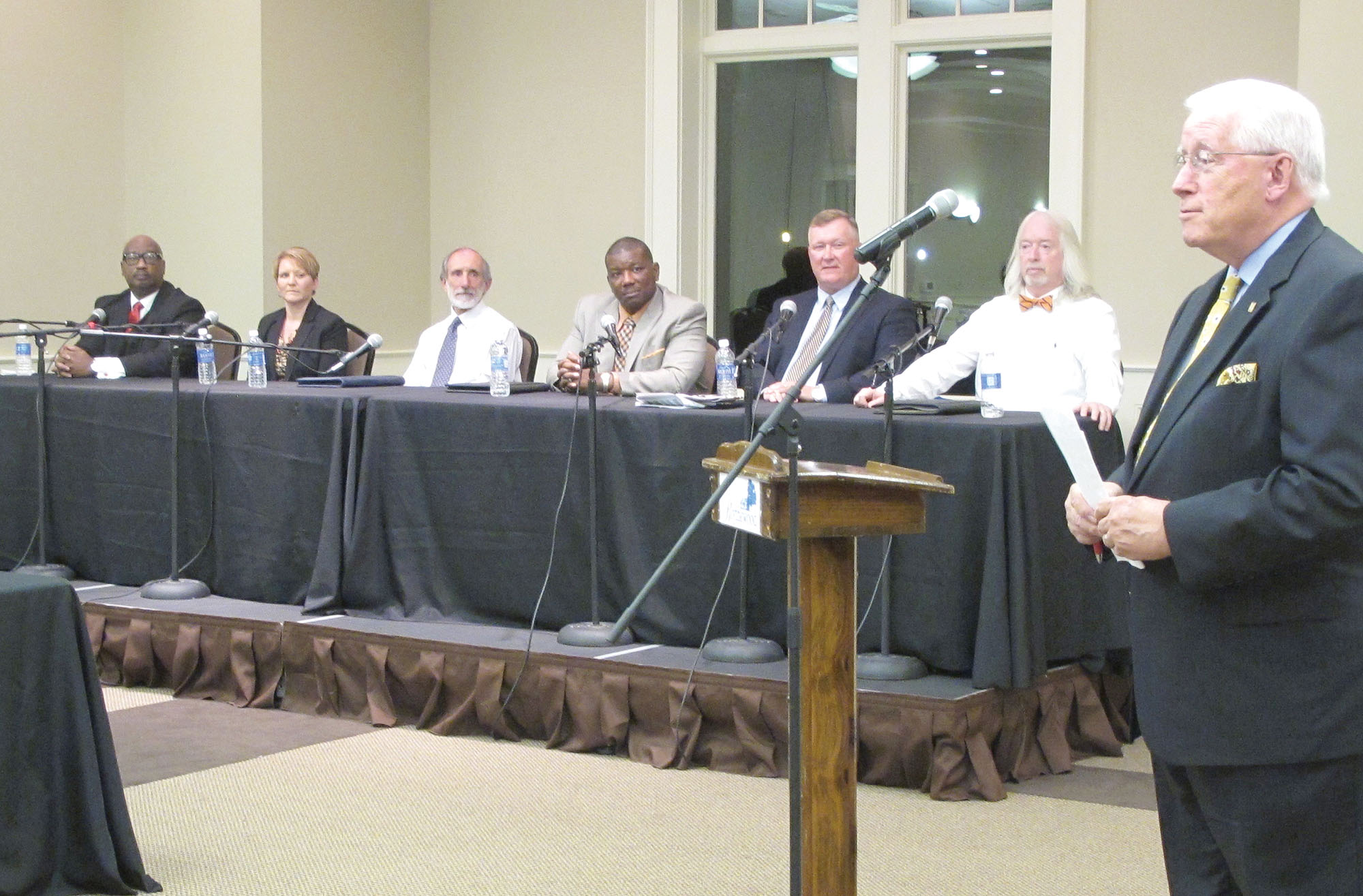 Six Candidates for three at-large seats on the Blythewood Town Council answered questions during a public forum Tuesday evening at The Manor. Ed Garrison, Chairman of the Blythewood Chamber of Commerce which sponsored the forum, welcomed the candidates, from left: Larry D. Griffin, Michelle Kiedrowski, Malcolm Gordge, Robert Rue, Bryan Franklin and incumbent Eddie Baughman. For a recap of what the candidates had to say about traffic, growth, a tax millage for the town and other hot button issues, see the Oct. 30 edition of The Voice.
