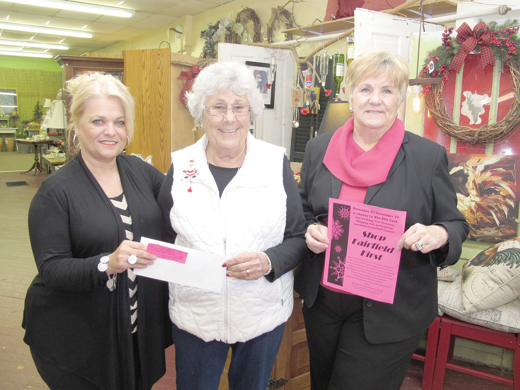 Mary Sistare, center, receives $50 for Shopping Fairfield First. Her name was drawn for her purchase at The Palmer Street Market which is owned by Robbie Martin, left. Terry Vickers, right, is president of the Fairfield Chamber of Commerce which sponsors Shop Fairfield First.