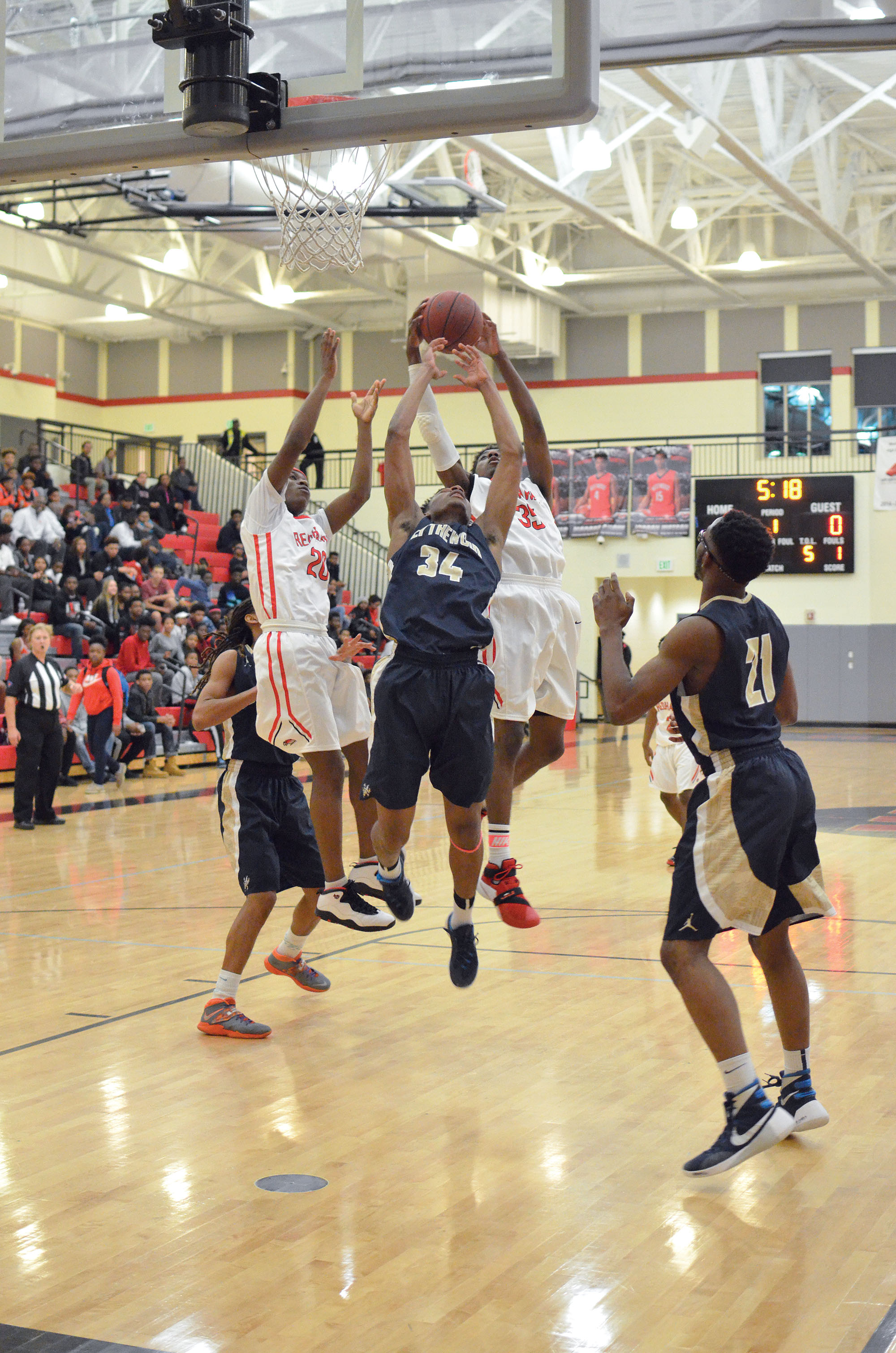 Westwood’s Adam Douglas (35) lifts the rebound from Trae Churn (34) as Jalen Robinson (20) makes a grab. (Photo/DeAnna Robinson)